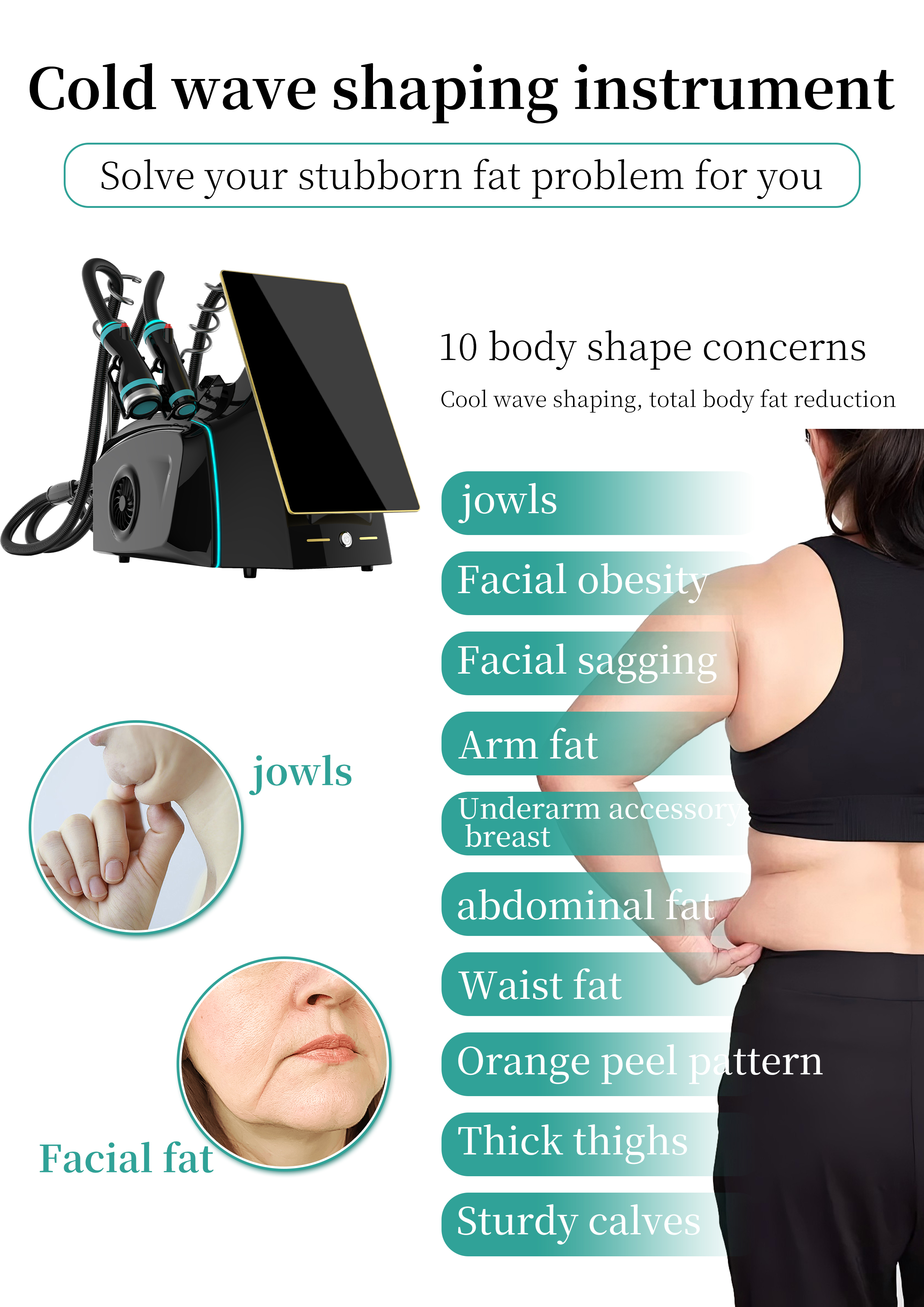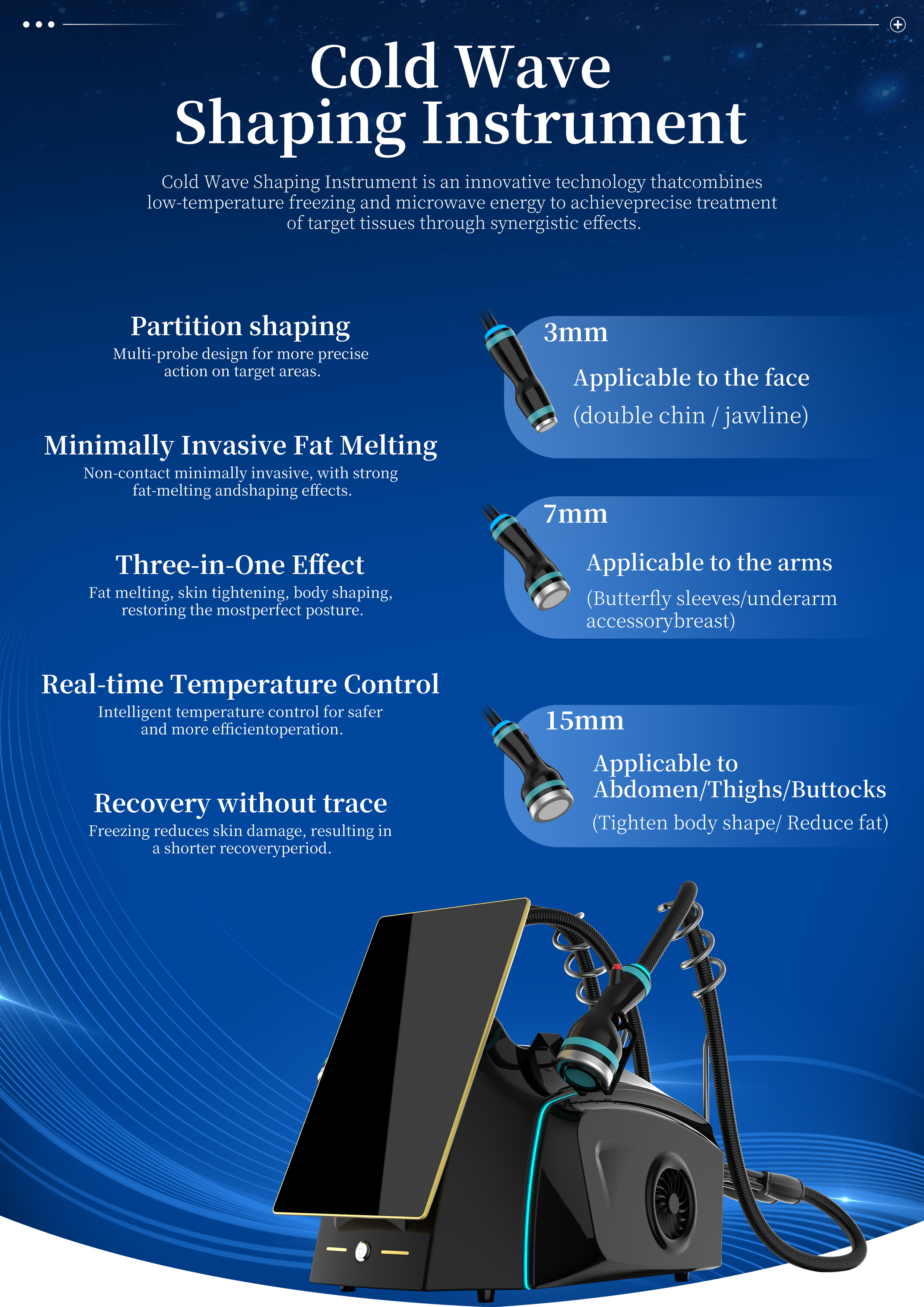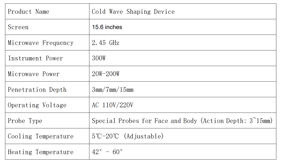 The Cryo-Microwave Shaping Instrument is a non-invasive aesthetic and body-shaping device that integrates low-temperature freezing and microwave energy. Leveraging the core technological advantages of "precise targeting + gentle and efficient", it is designed to improve local fat accumulation and shape body contours. While ensuring treatment safety and comfort, it achieves multiple aesthetic effects such as fat reduction, skin tightening, and cellulite improvement, providing an innovative solution for the aesthetic and body-shaping field.