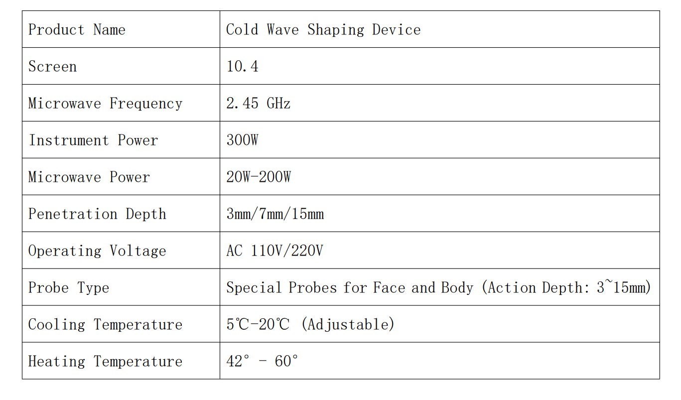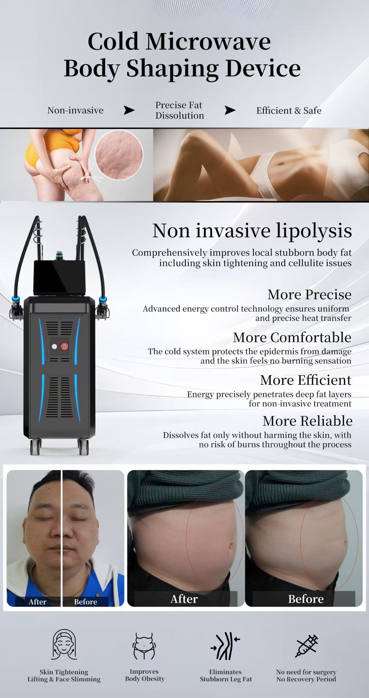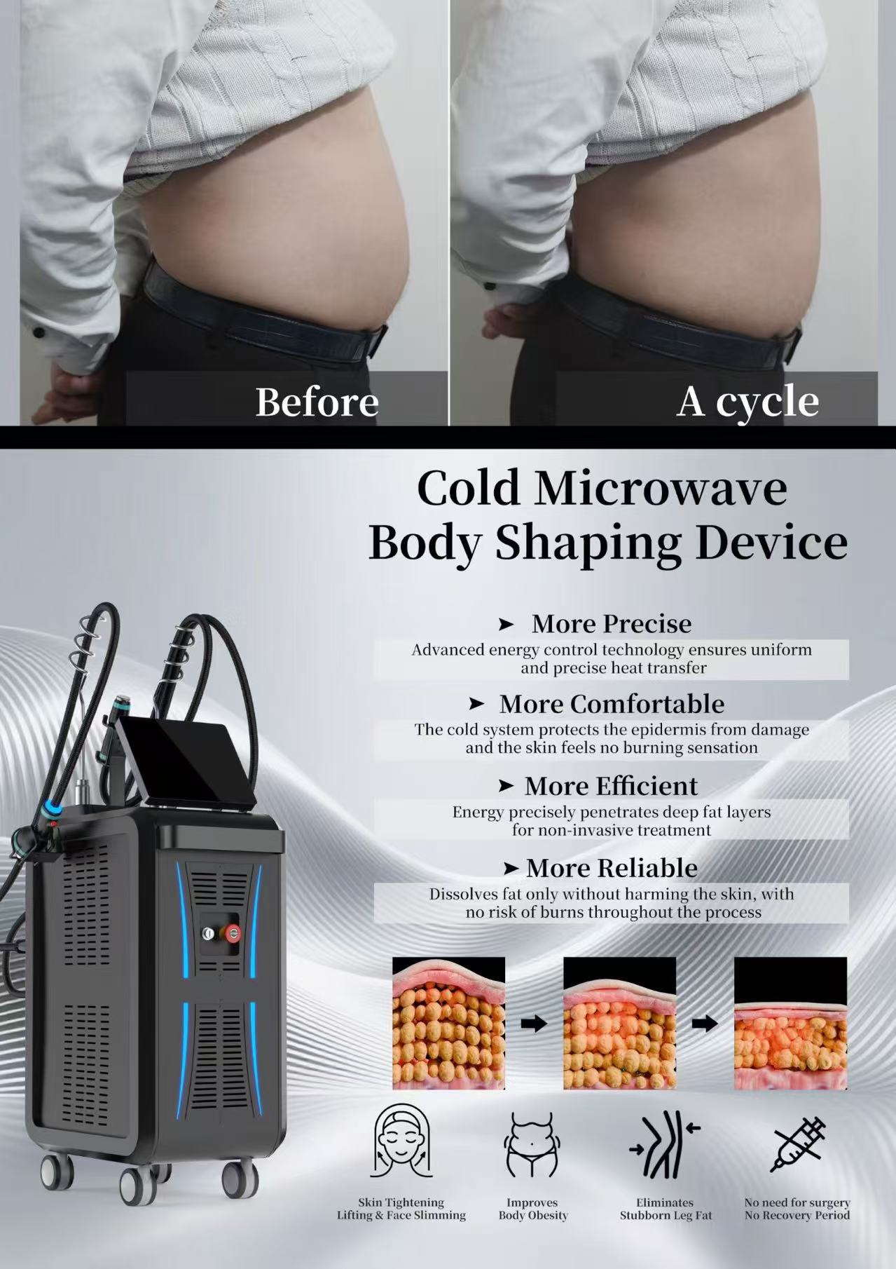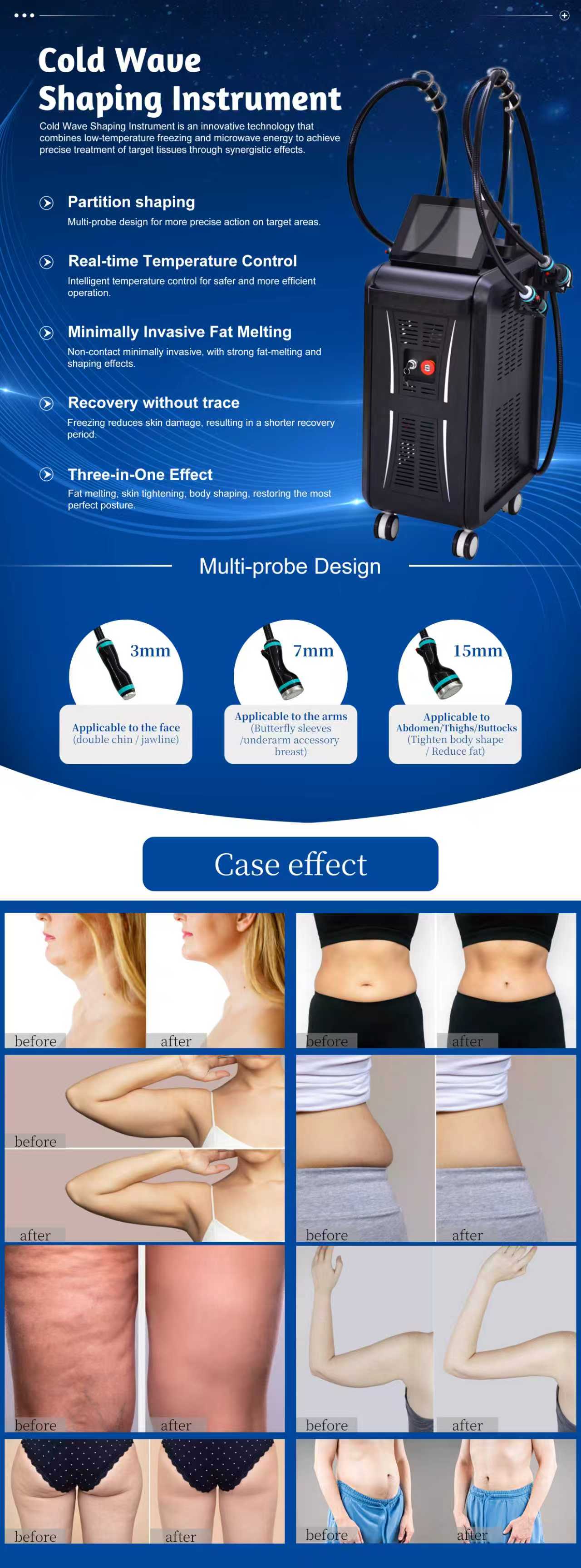 The Cryo-Microwave Shaping Instrument is a non-invasive aesthetic and body-shaping device that integrates low-temperature freezing and microwave energy. Leveraging the core technological advantages of "precise targeting + gentle and efficient", it is designed to improve local fat accumulation and shape body contours. While ensuring treatment safety and comfort, it achieves multiple aesthetic effects such as fat reduction, skin tightening, and cellulite improvement, providing an innovative solution for the aesthetic and body-shaping field.