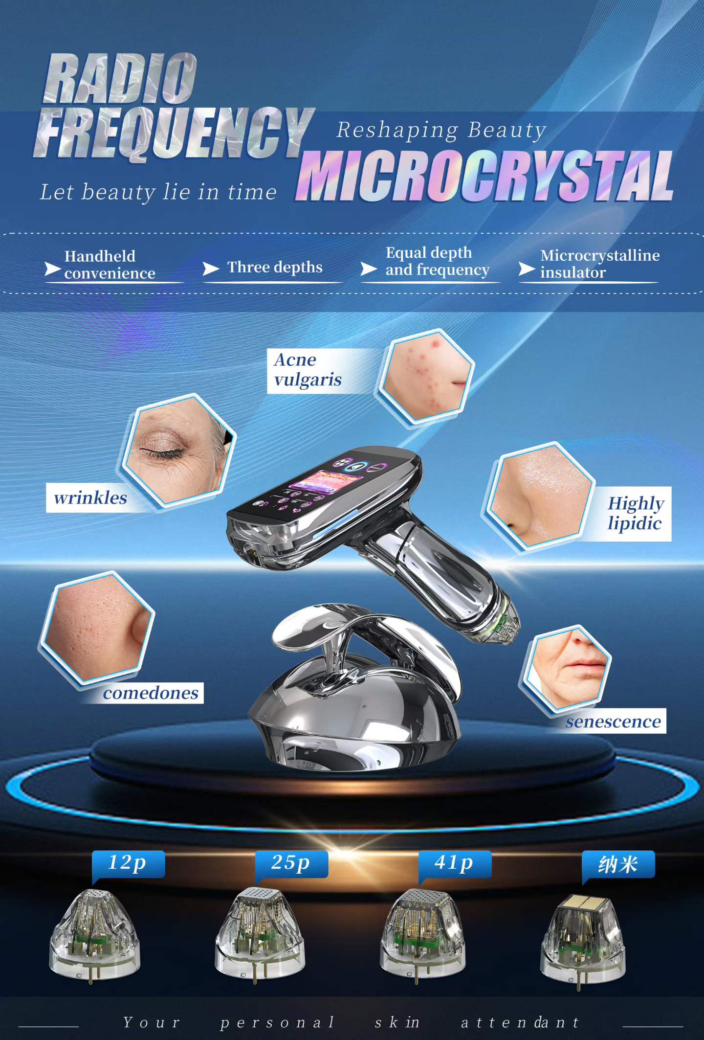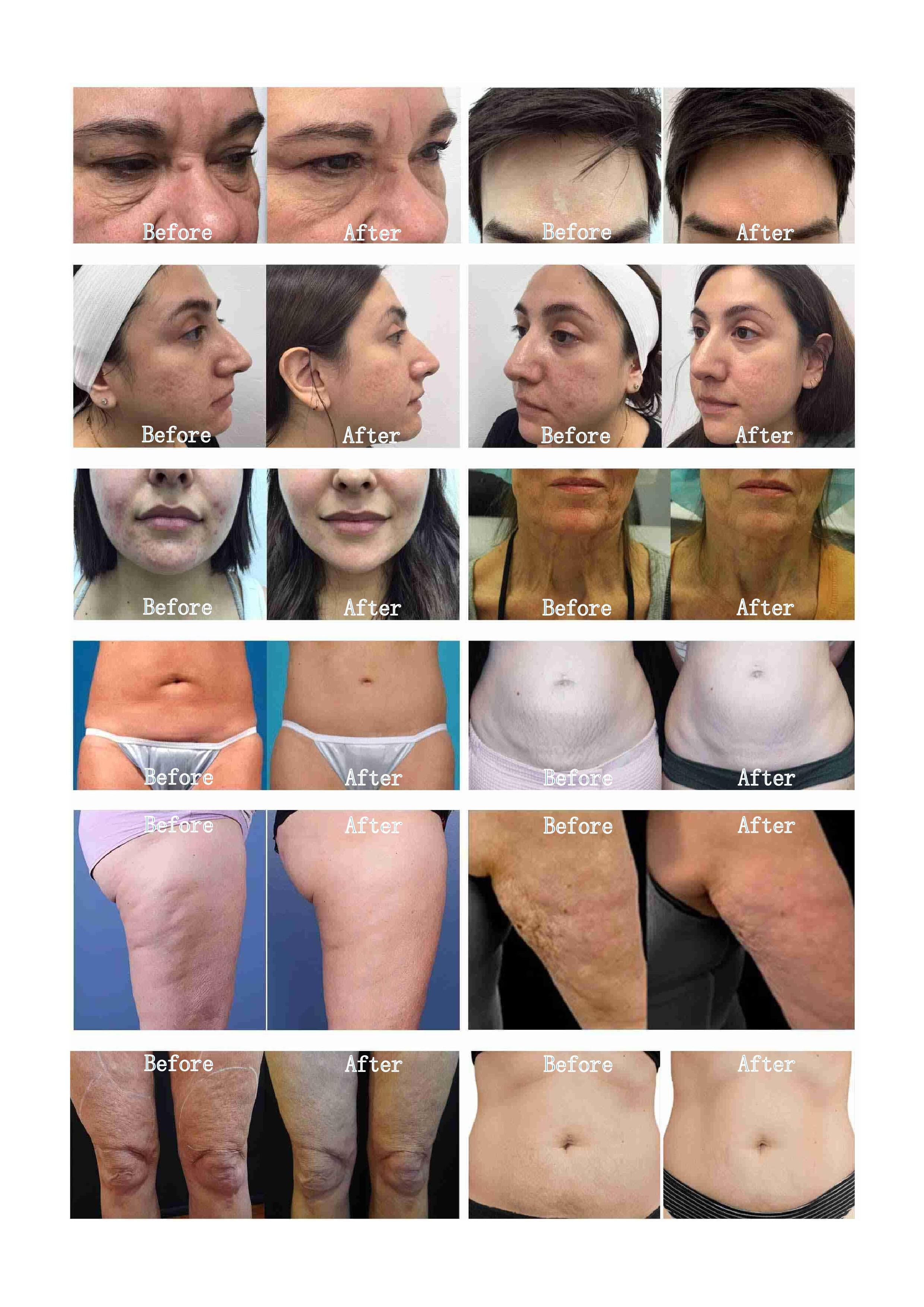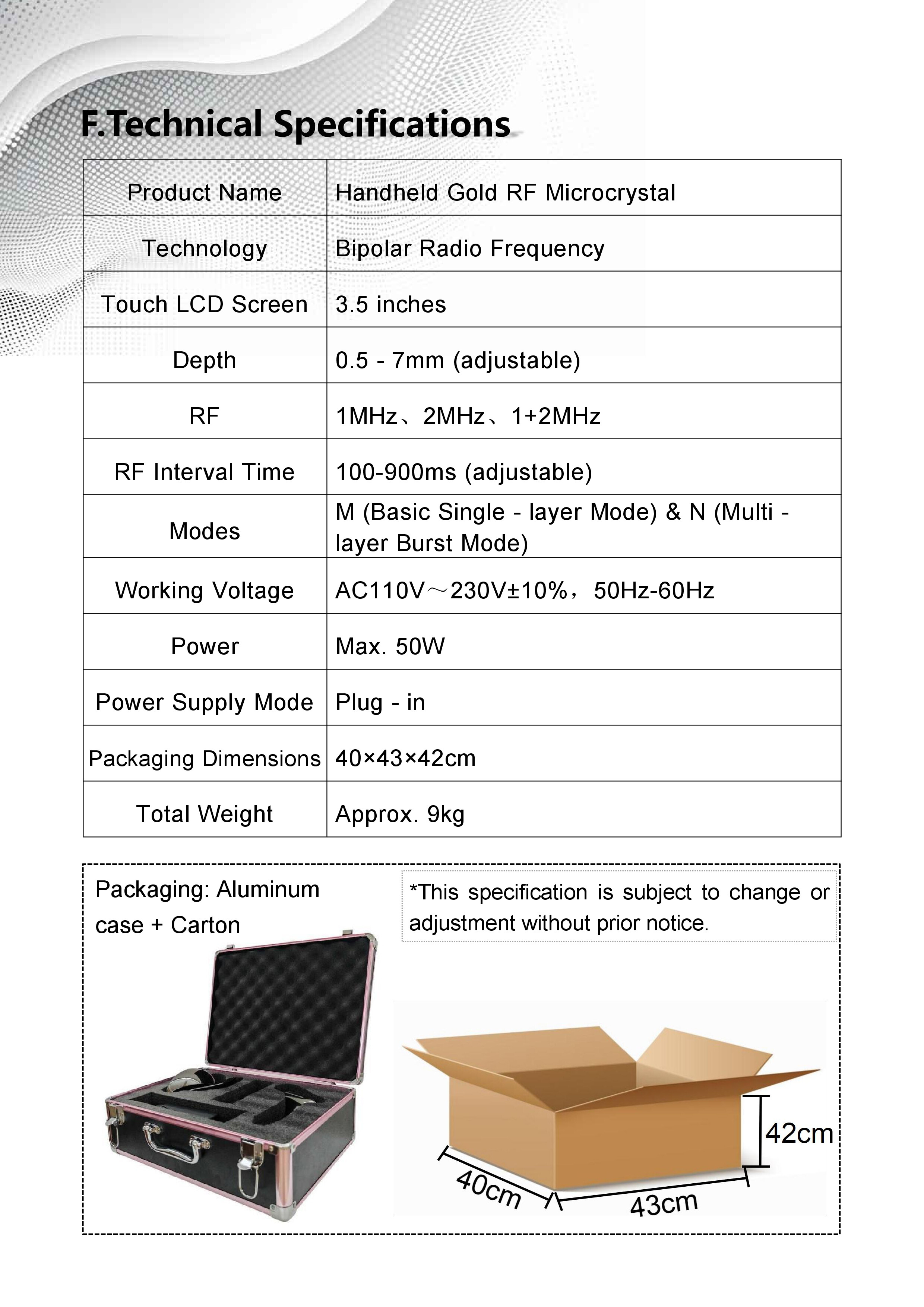 The handheld gold RF microcrystal device is an innovative RF microneedle device, a programmable point array RF device with adjustable penetration depth and energy transmission capabilities. It utilizes segmented RF microneedle technology to deliver targeted treatments at multiple layers of the skin and fat. The RF heating coagulates fat and contracts connective tissue, stimulating and remodeling collagen to improve skin appearance, tighten the skin. It provides localized remodeling and tightening of the skin in targeted areas of the face and body, making the skin smooth. It is suitable for all skin tones. It can address issues such as skin sagging, acne, scars, acne marks, pores, fine lines and wrinkles, stretch marks, fat clusters, and excessive fat accumulation. It is a safe, effective, non-surgical, minimally invasive method for reconstructing the skin’s surface, tightening the skin, and reducing stubborn body fat deposits. It is the second-best option after surgery.