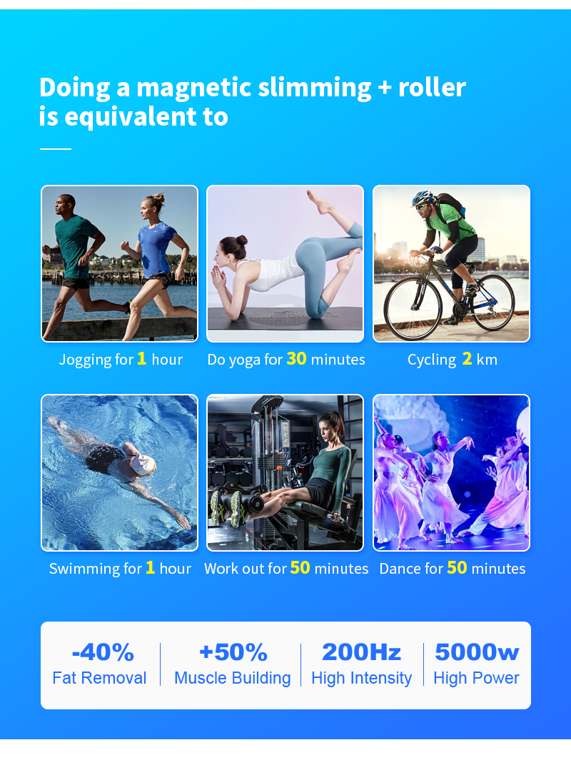 The 100% extreme muscle contraction of HI- EMT technology can trigger a large amount of fat breakdown, and fatty acids are decom-posed and flowed out from triglycerides and accumulated in adipocytes. Too high levels of faty acids cause fat cells to die and beexcreted by the body's normal metabolism within a few weeks.