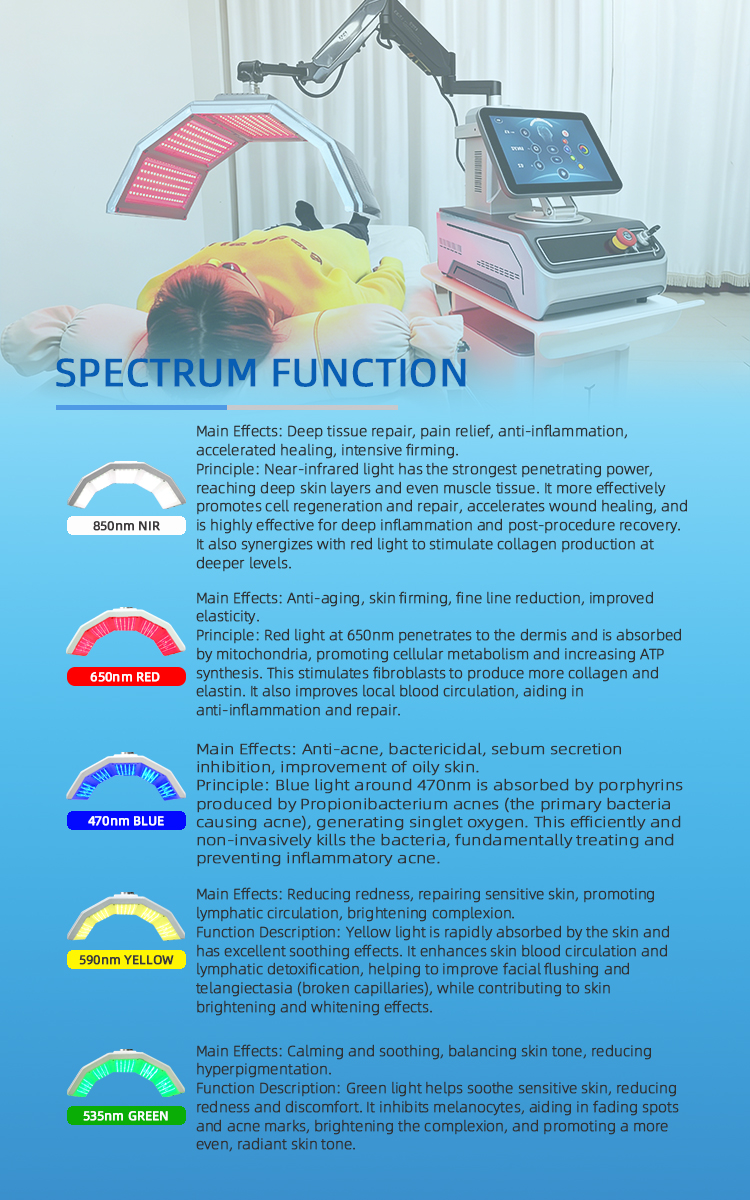 PDT (Photodynamic Therapy), also known as "magic light," is a biologically active cold light technology that generates no significant heat. It uses low-energy pure light and light modulation techniques to convert light energy into intracellular energy, accelerating cell growth, boosting blood circulation, and stimulating fibroblasts to produce collagen and elastin. This enhances skin elasticity, repairs aging skin, and effectively addresses acneprone and sensitive skin conditions.This device integrates multiple specific wavelengths of visible light with near-infrared light for layered, multi-dimensional skin management:
