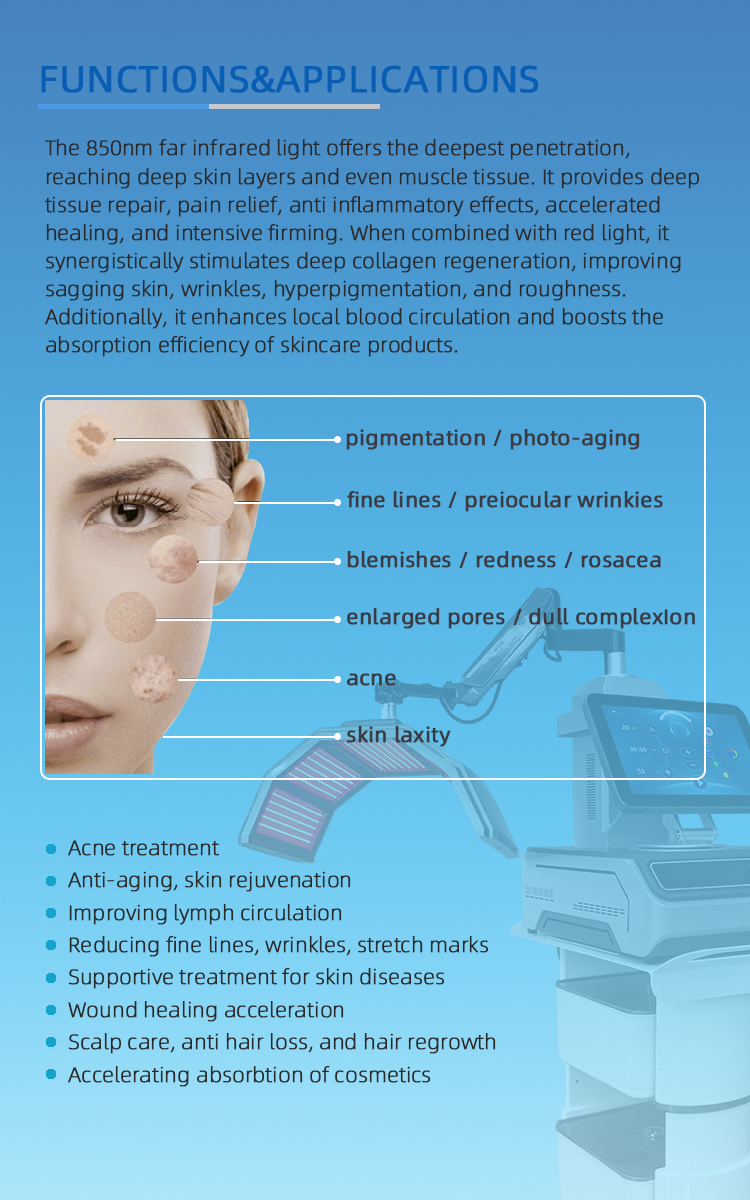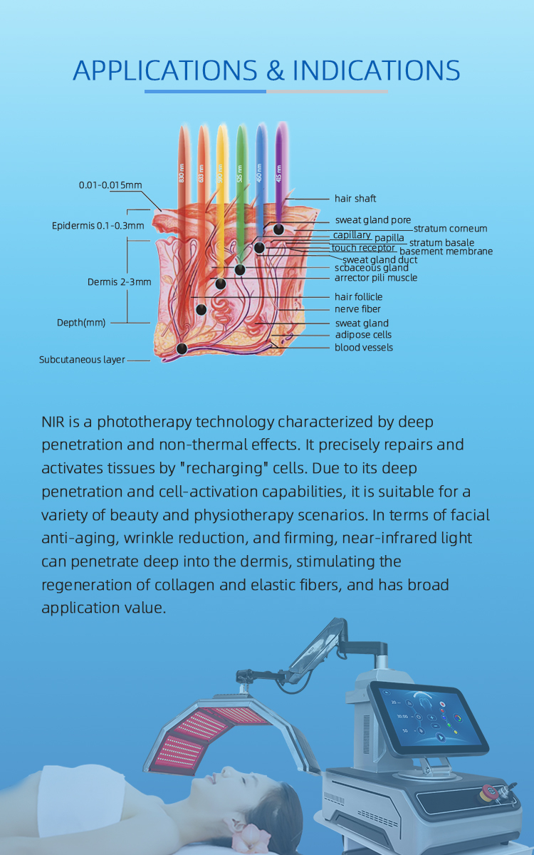 • Near-infrared light (850nm) : Offers the deepest penetration, reaching deep skin layers and even muscle tissue. It provides deep tissue repair, pain relief, anti-inflammatory effects, accelerated healing, and intensive firming. When combined with red light, it synergistically stimulates deep collagen regeneration, improving wrinkles, sagging, hyperpigmentation, and roughness.