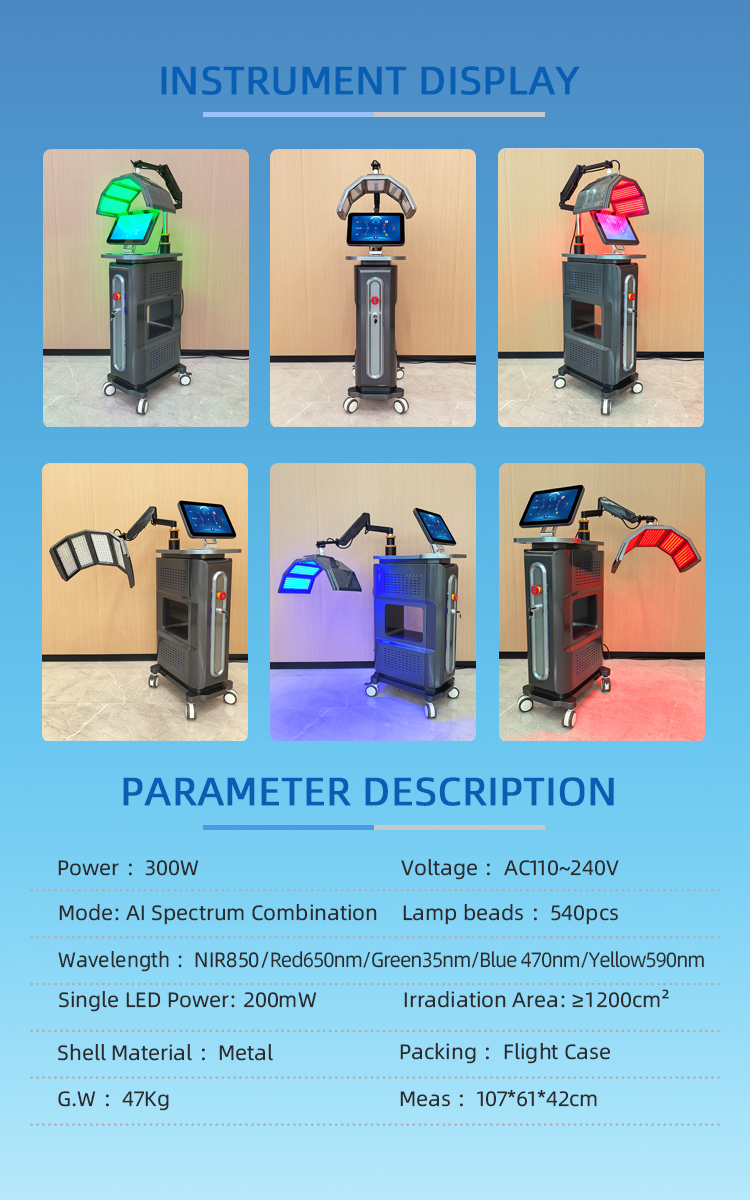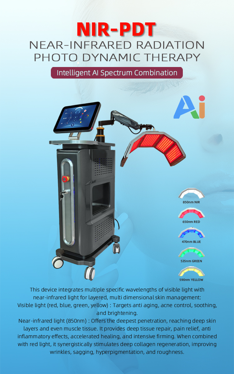 PDT (Photodynamic Therapy), also known as "magic light," is a biologically active cold light technology that generates no significant heat. It uses low-energy pure light and light modulation techniques to convert light energy into intracellular energy, accelerating cell growth, boosting blood circulation, and stimulating fibroblasts to produce collagen and elastin. This enhances skin elasticity, repairs aging skin, and effectively addresses acneprone and sensitive skin conditions.This device integrates multiple specific wavelengths of visible light with near-infrared light for layered, multi-dimensional skin management: