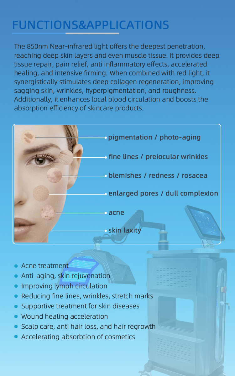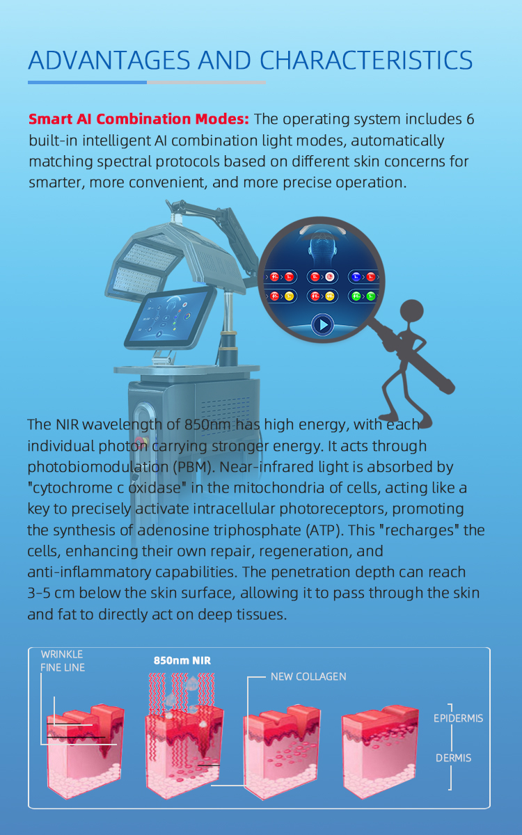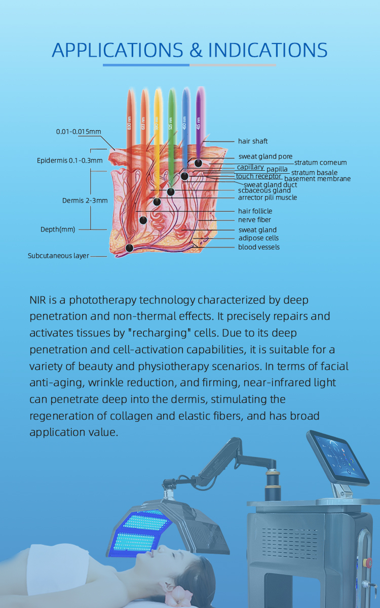 • Near-infrared light (850nm) : Offers the deepest penetration, reaching deep skin layers and even muscle tissue. It provides deep tissue repair, pain relief, anti-inflammatory effects, accelerated healing, and intensive firming. When combined with red light, it synergistically stimulates deep collagen regeneration, improving wrinkles, sagging, hyperpigmentation, and roughness.