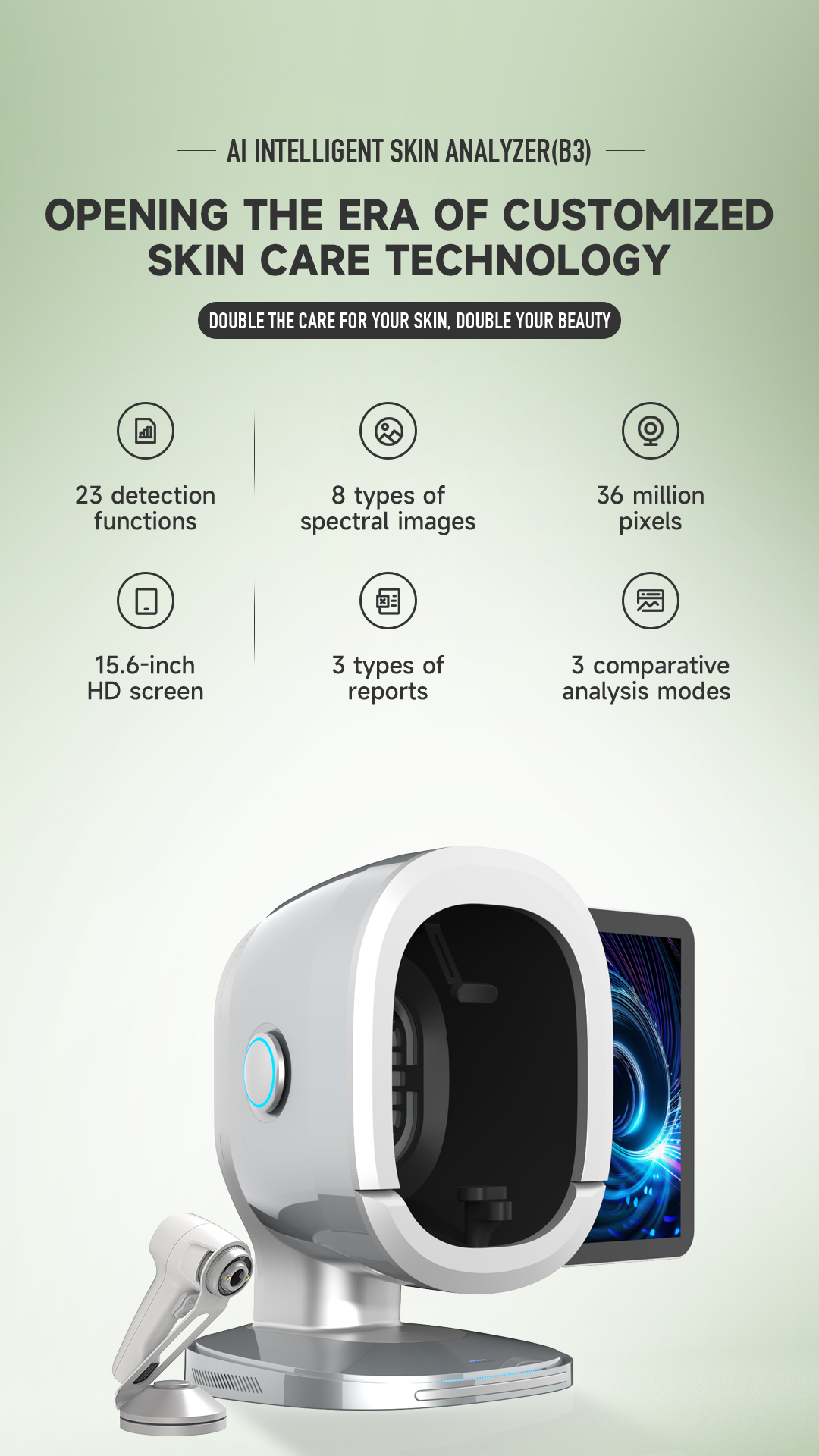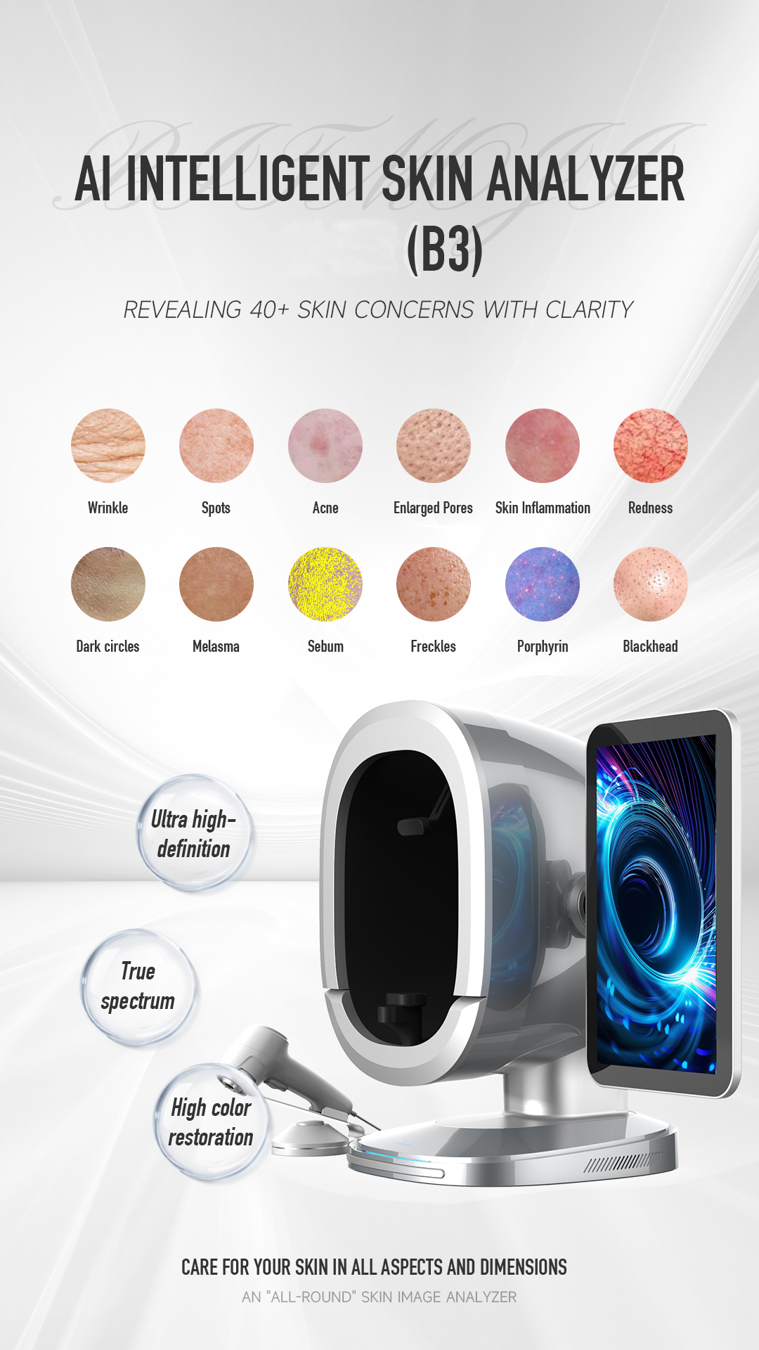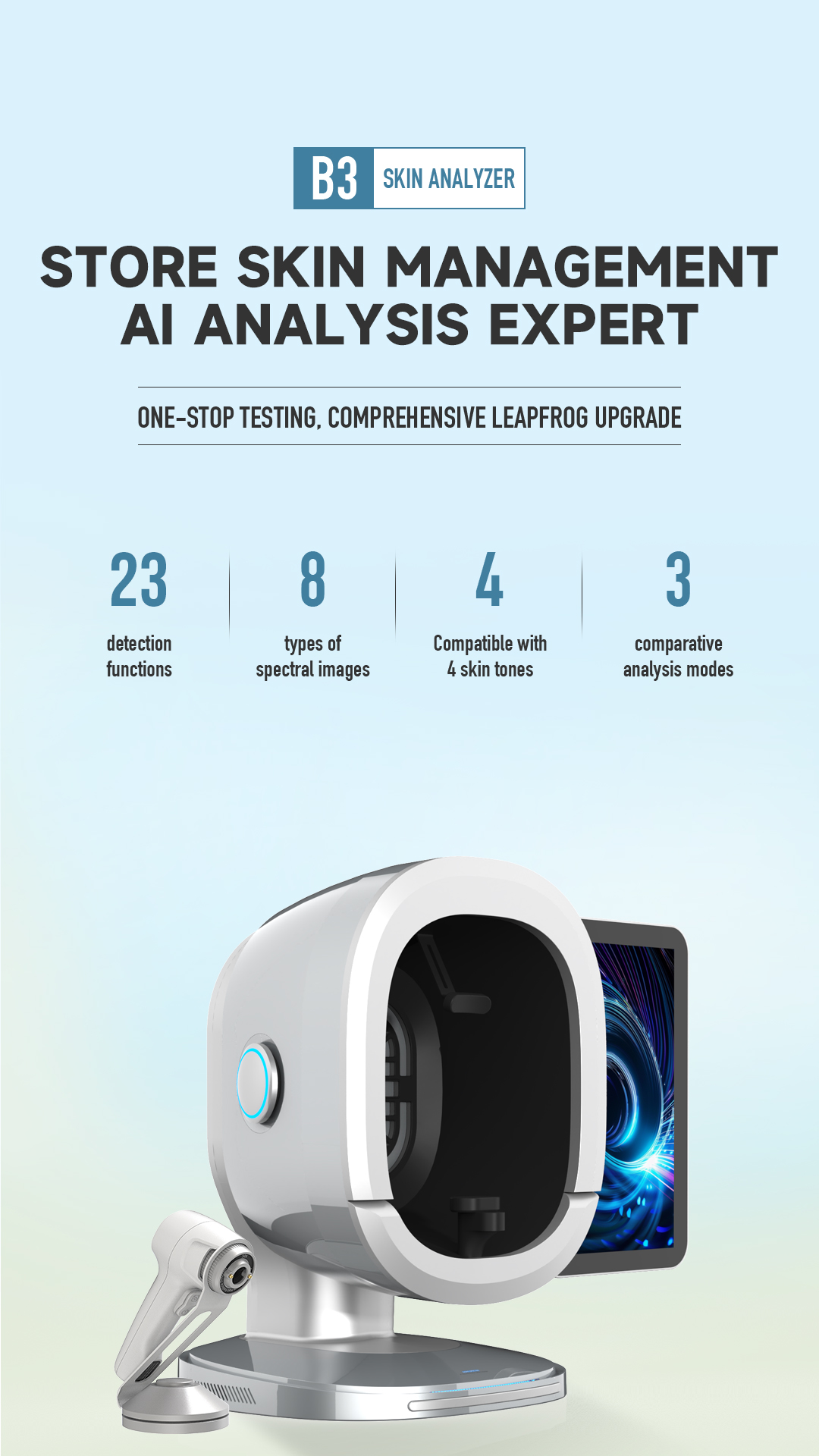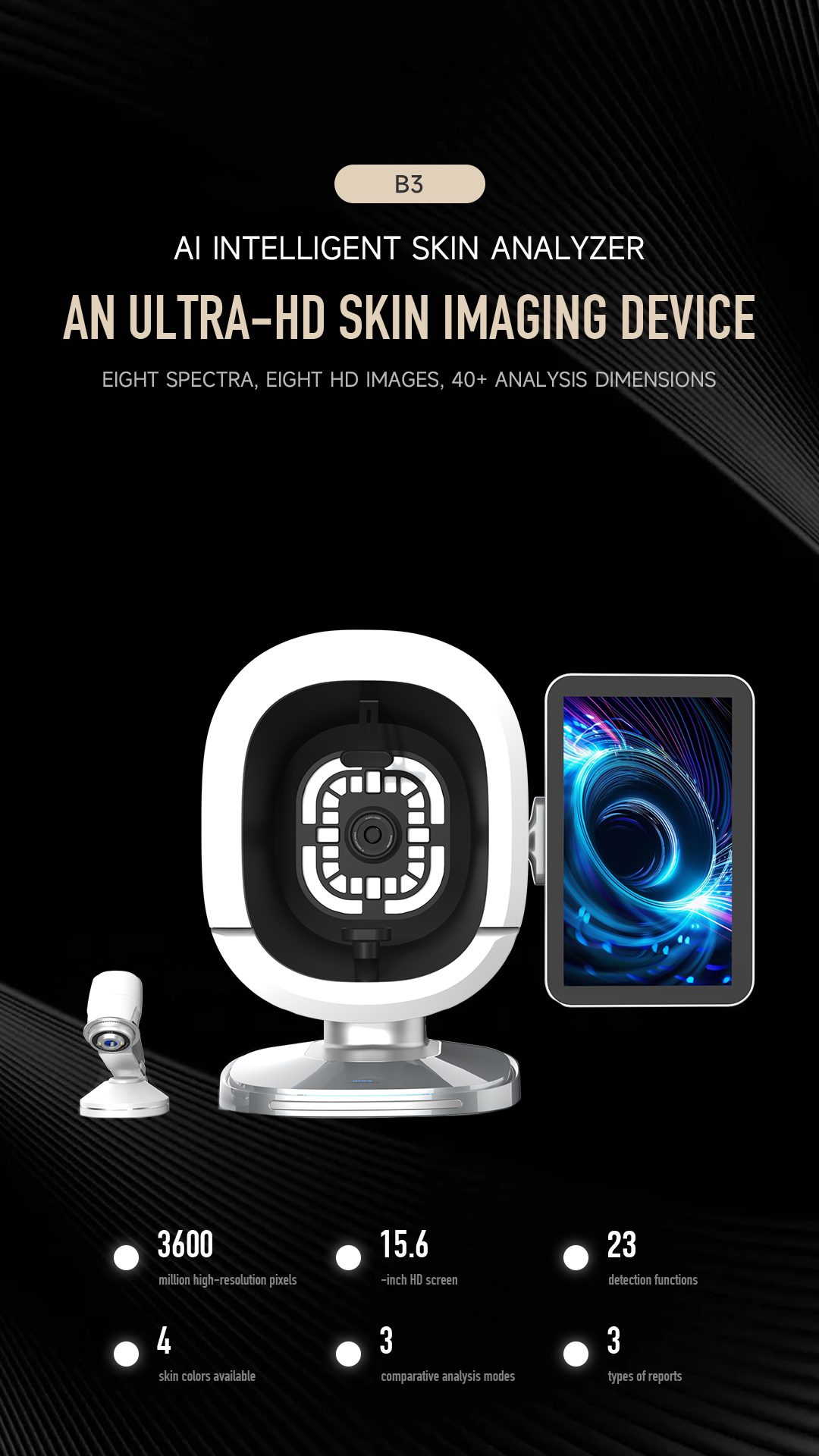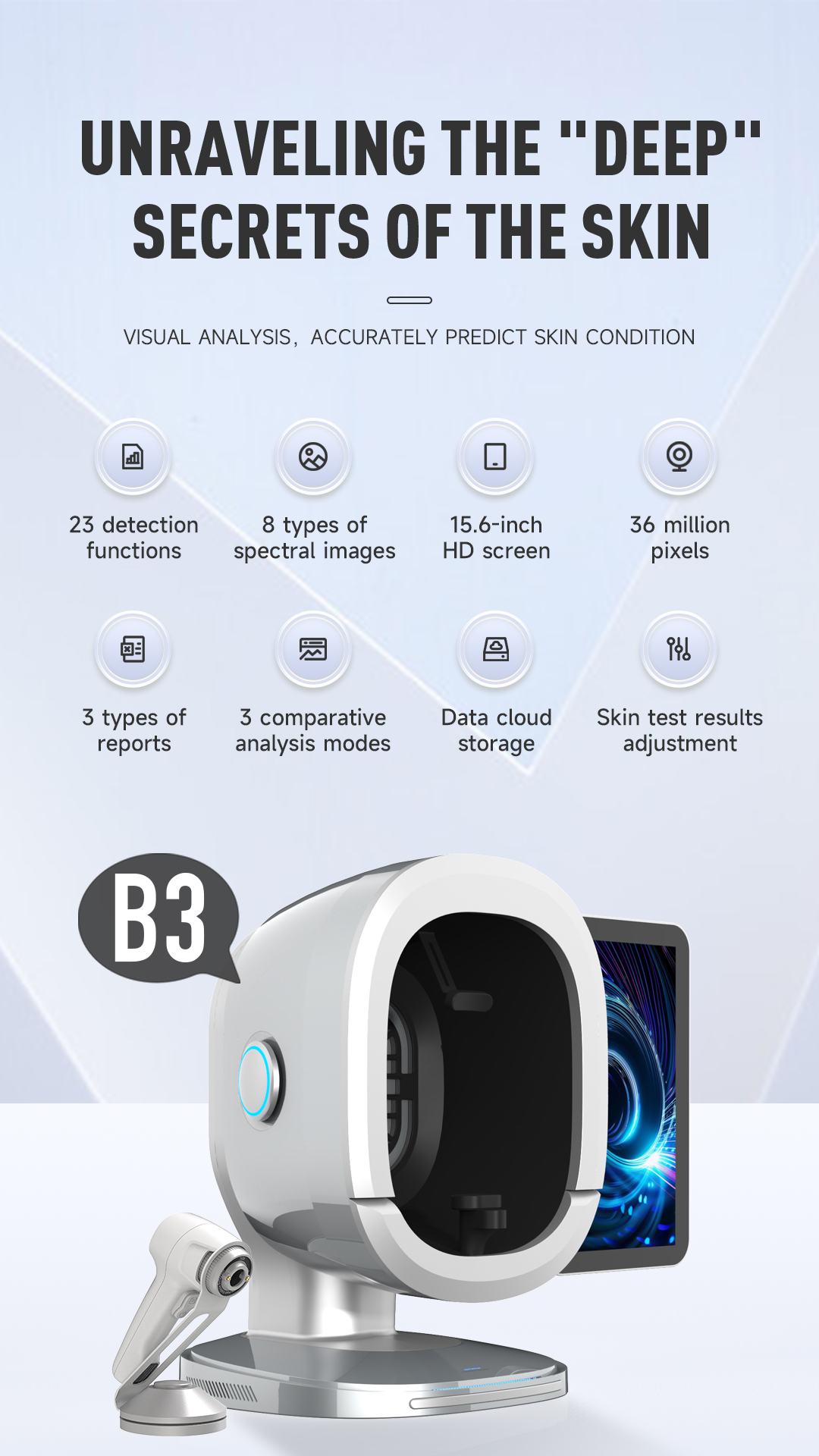 B3 Al Intelligent skin analyzer : With a research and development focus on solving skin problems, it integrates eight spectral imaging technologies and can professionally and objectively analyze seventeen problems of facial skin with flexible operations. The original intention of the research and development is to take photos and analyze reports with just one click, making it more convenient to operate.