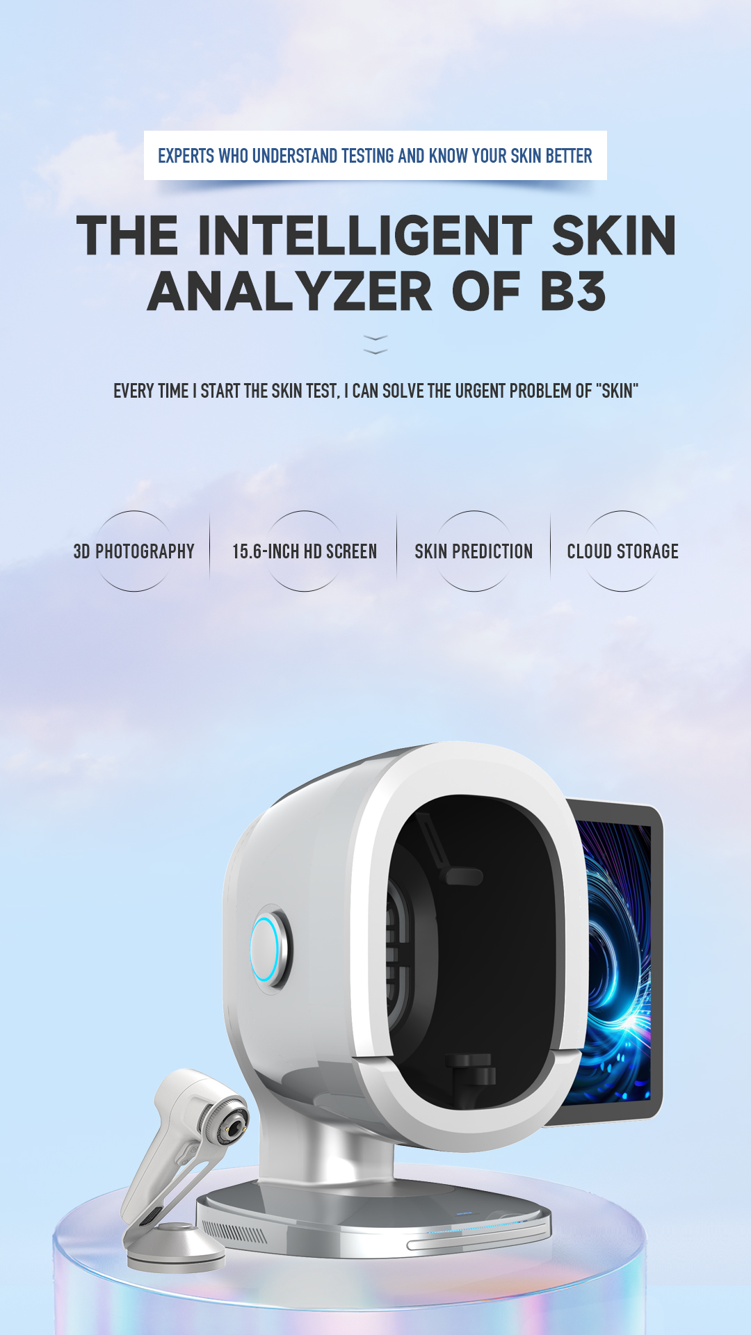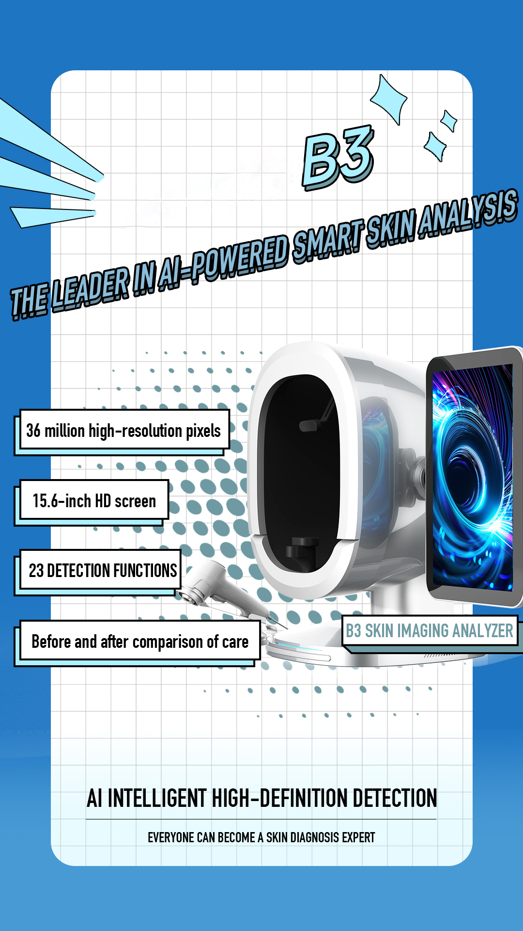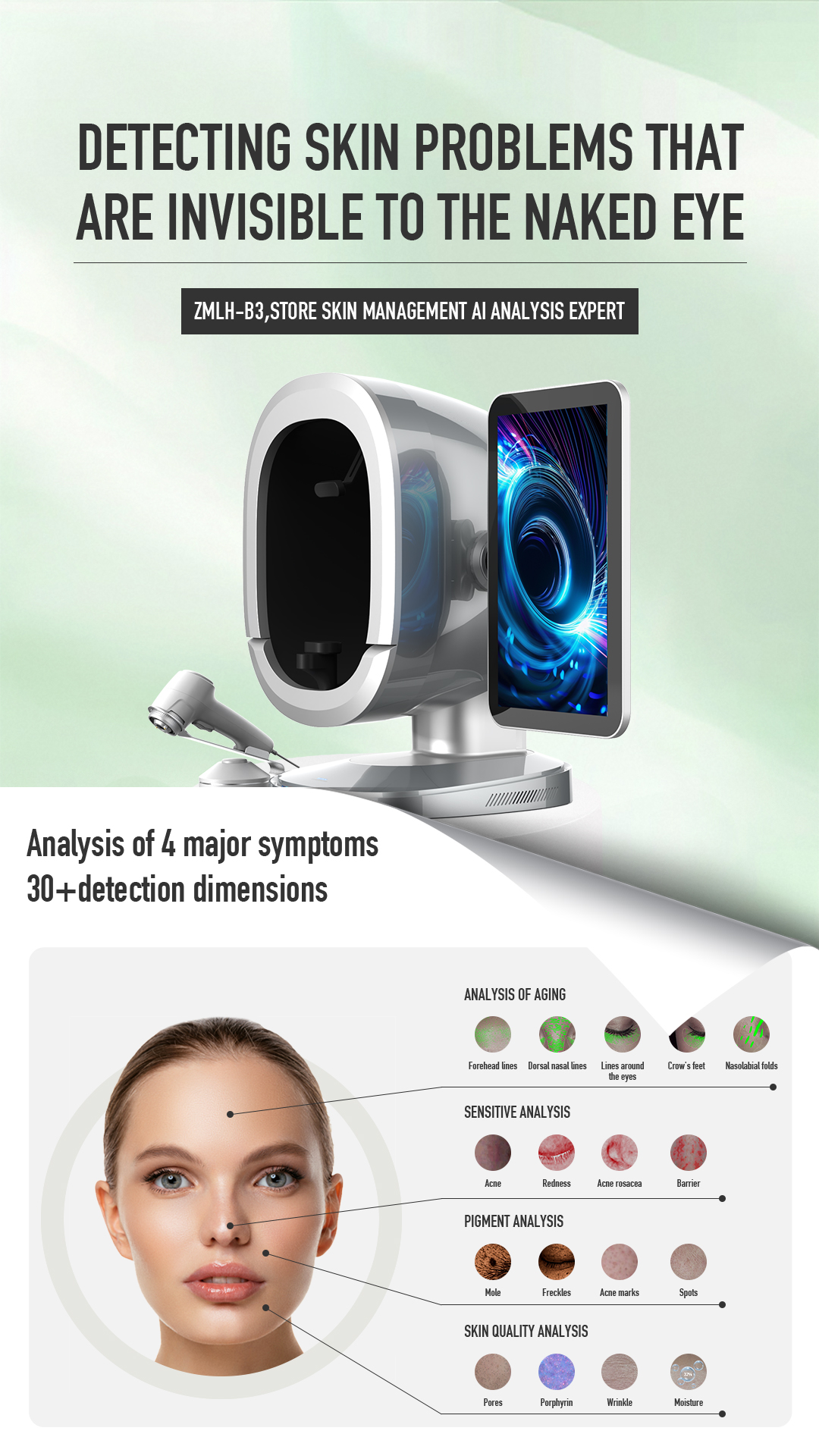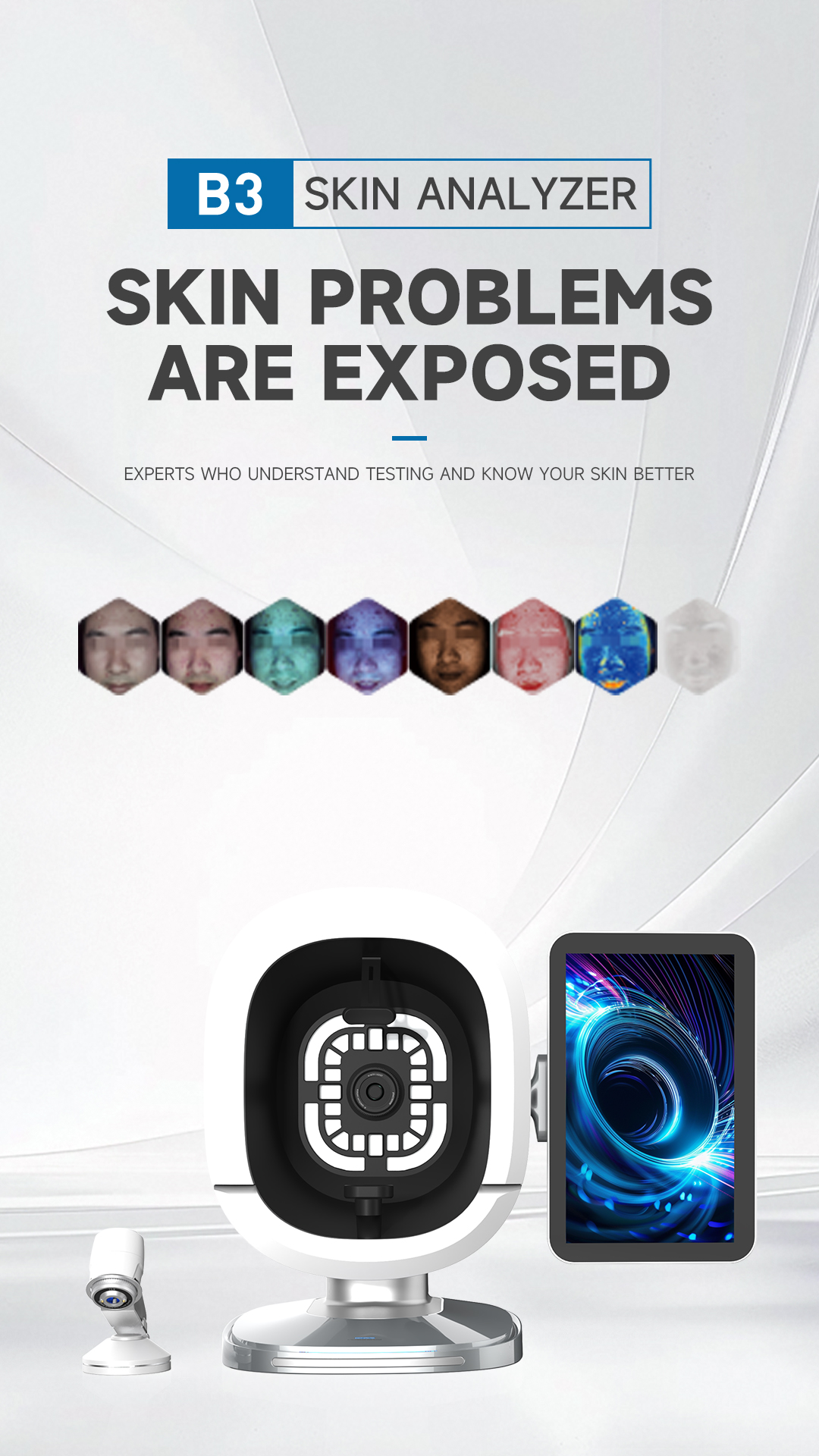 B3 Al Intelligent skin analyzer : With a research and development focus on solving skin problems, it integrates eight spectral imaging technologies and can professionally and objectively analyze seventeen problems of facial skin with flexible operations. The original intention of the research and development is to take photos and analyze reports with just one click, making it more convenient to operate.
