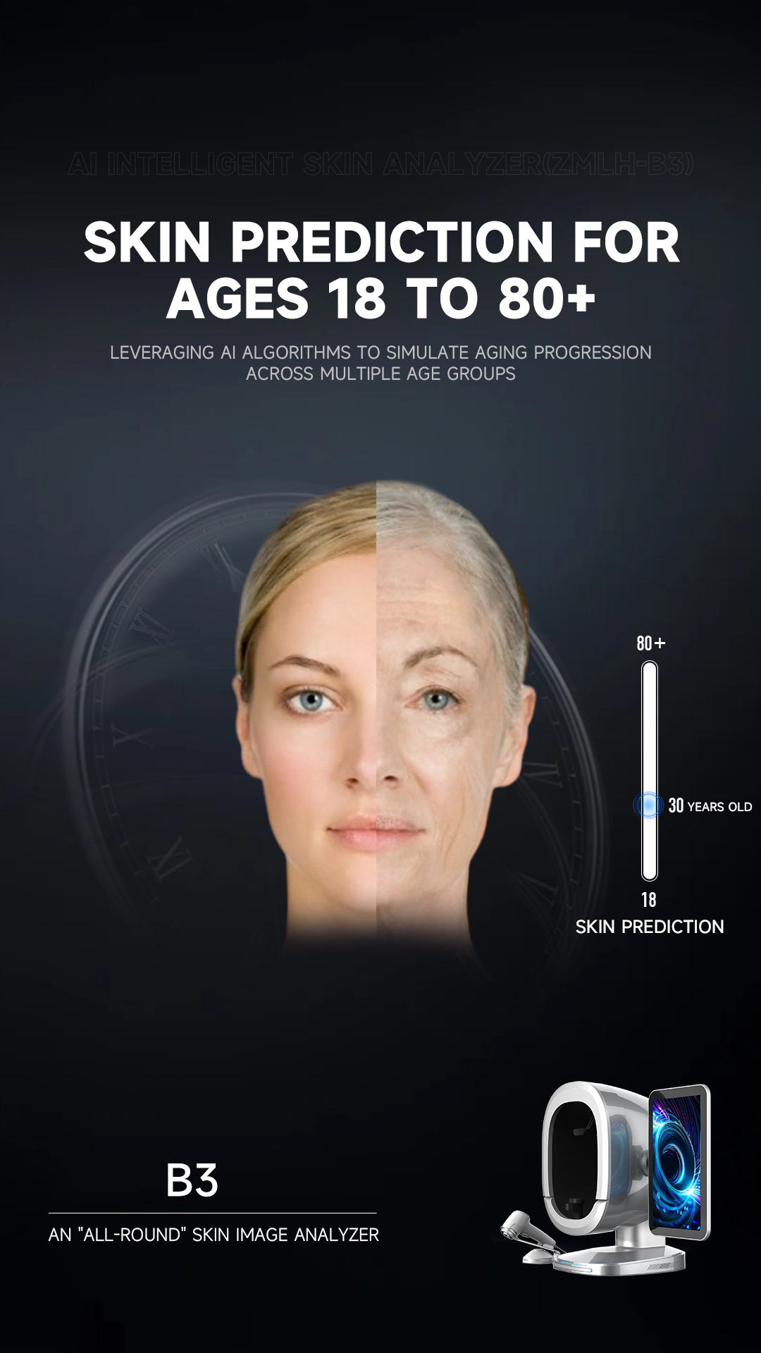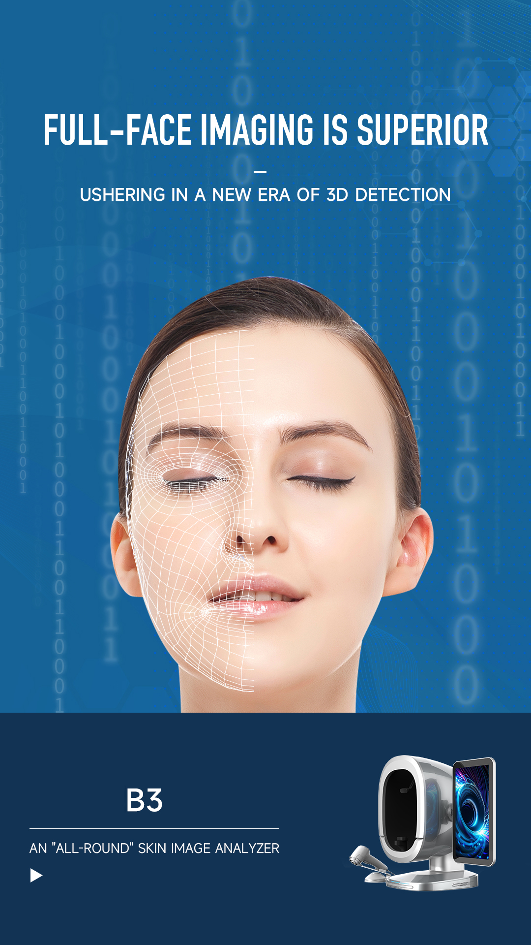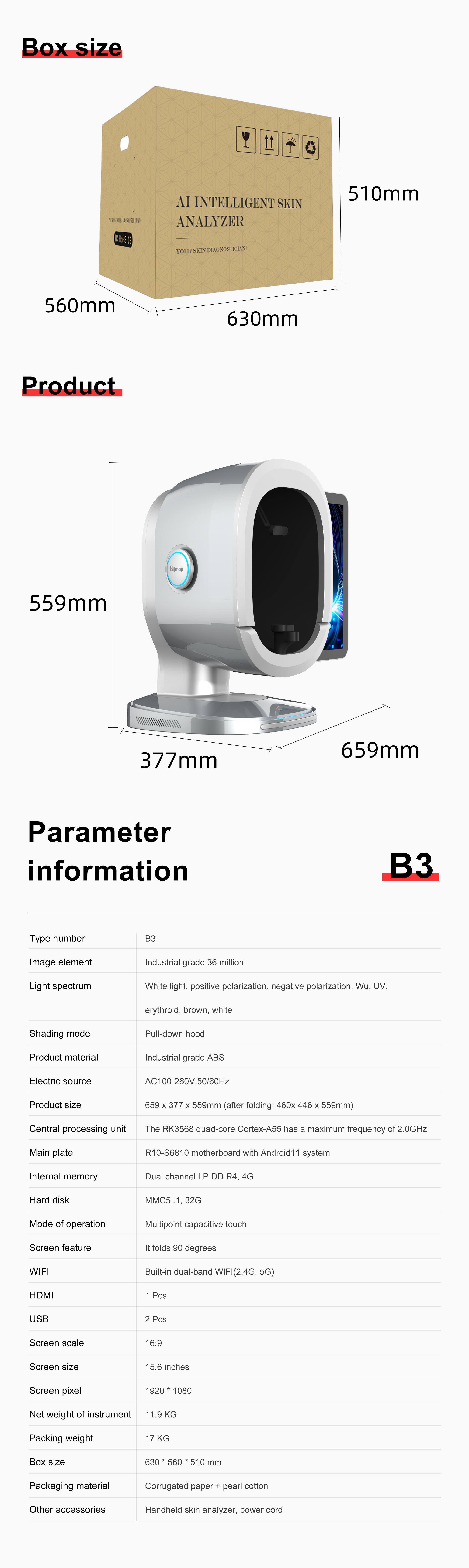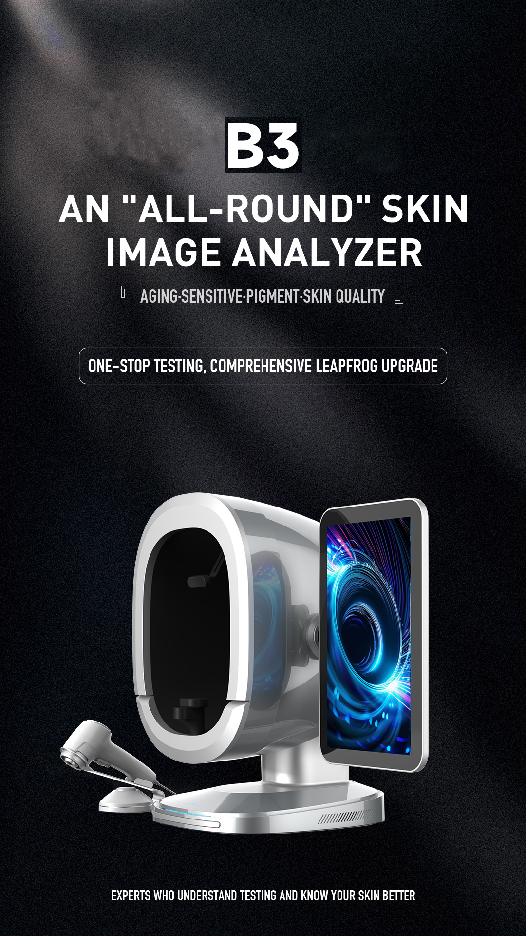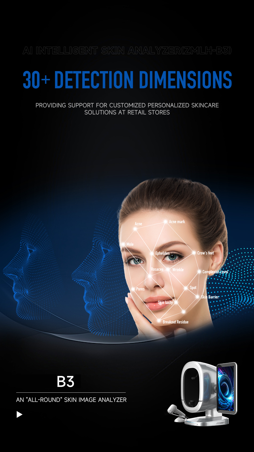 B3 Al Intelligent skin analyzer : With a research and development focus on solving skin problems, it integrates eight spectral imaging technologies and can professionally and objectively analyze seventeen problems of facial skin with flexible operations. The original intention of the research and development is to take photos and analyze reports with just one click, making it more convenient to operate.
