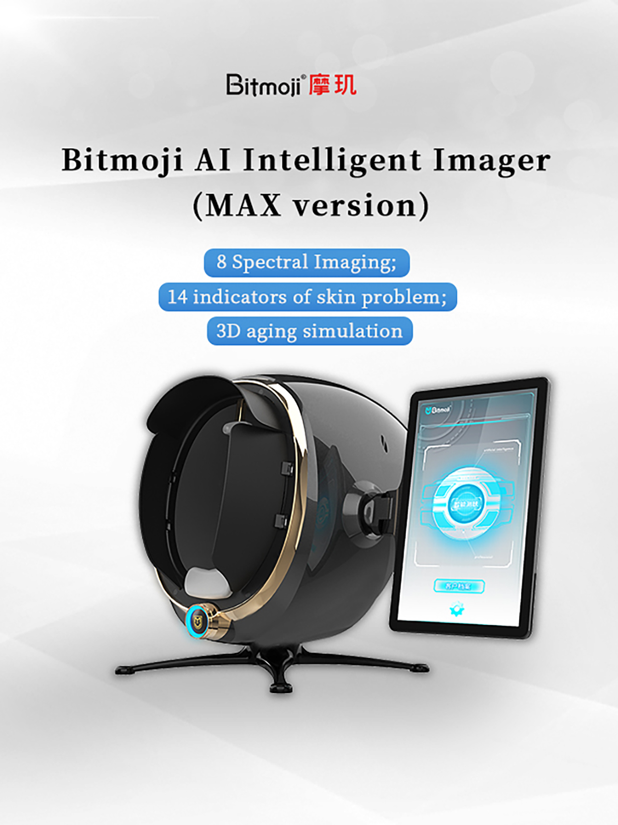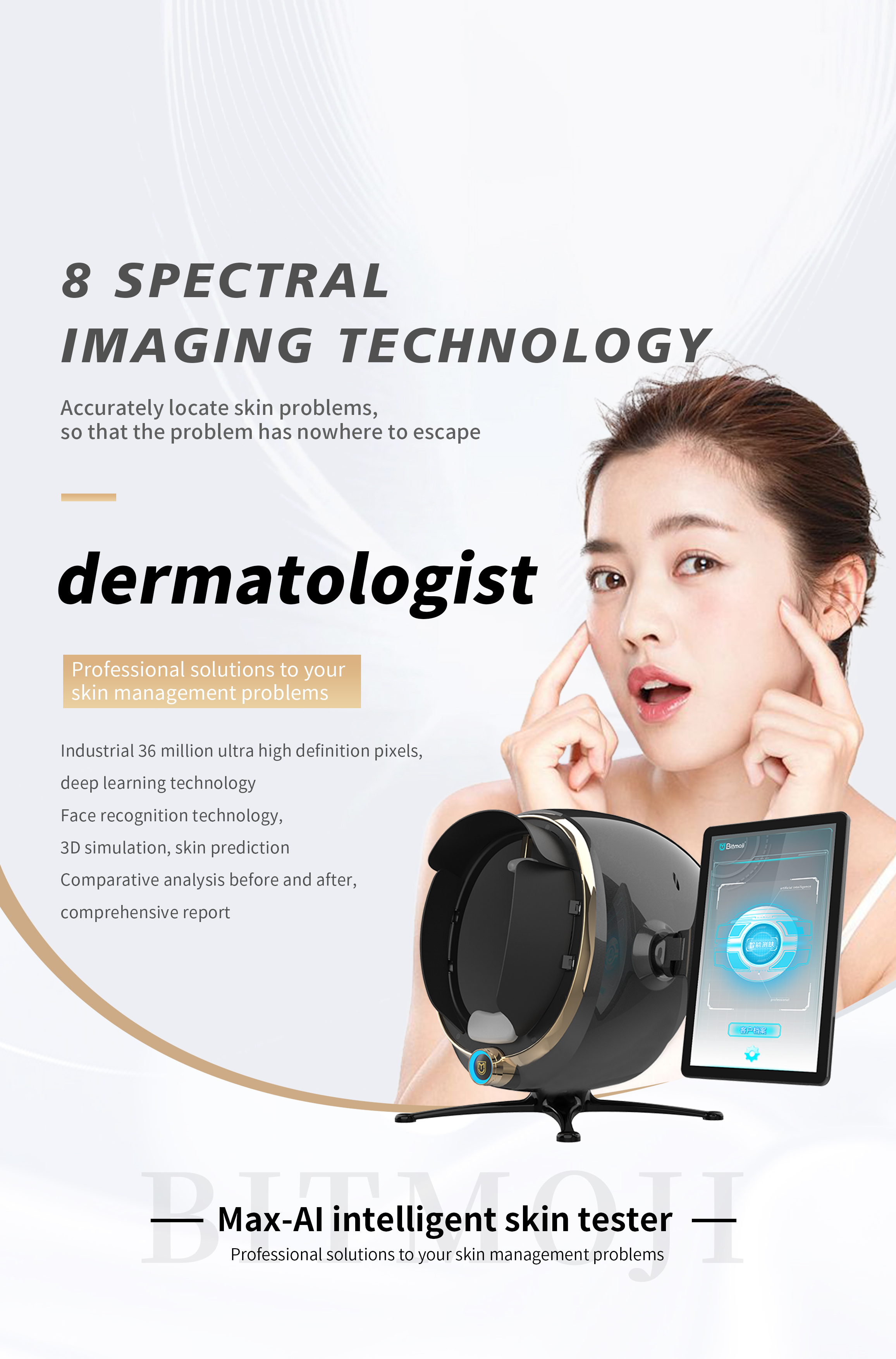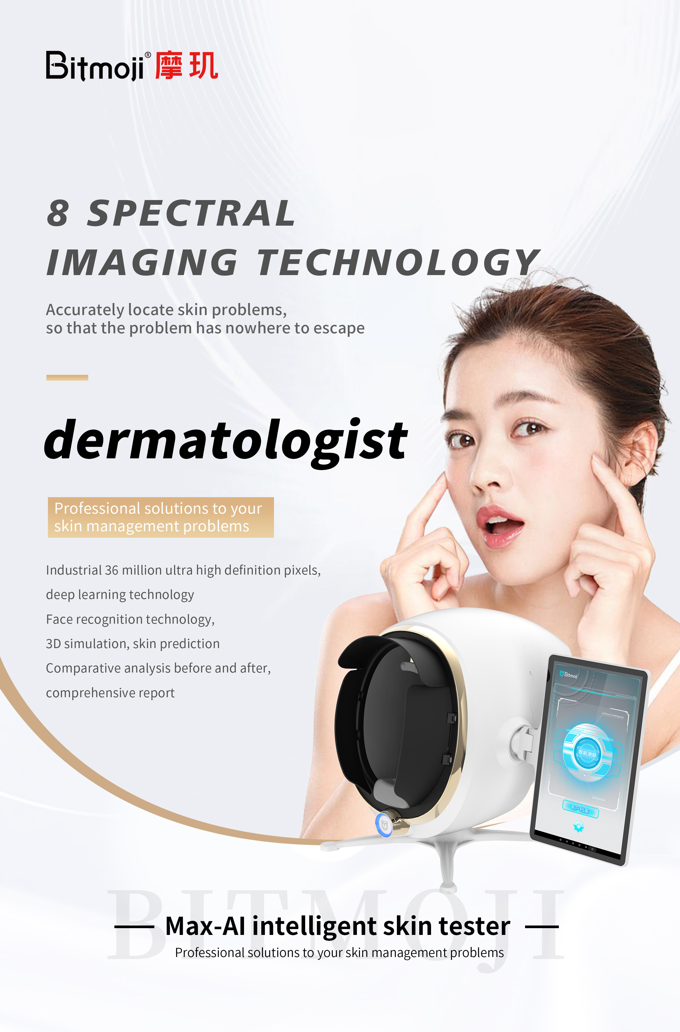 Emoji AI Skin Tester-Max Version captures the images of facial skin through industrial-grade high-definition effects with 8 light sources such as white light, positive polarized light, negative polarized light, UV light, blue light, Wu's light, brown light, and red light. It adopts the technologies of spectral imaging, AI face recognition, deep learning, 3D skin simulation, cloud computing/cloud storage to conduct the quantitative analysis on the pathological features of surficial and deep skin, and comprehensively detect 14 indicators for skin health. Comprehensive analysis and evaluation of skin problems provide reasonable evidences for scientific and accurate management of the skin.
