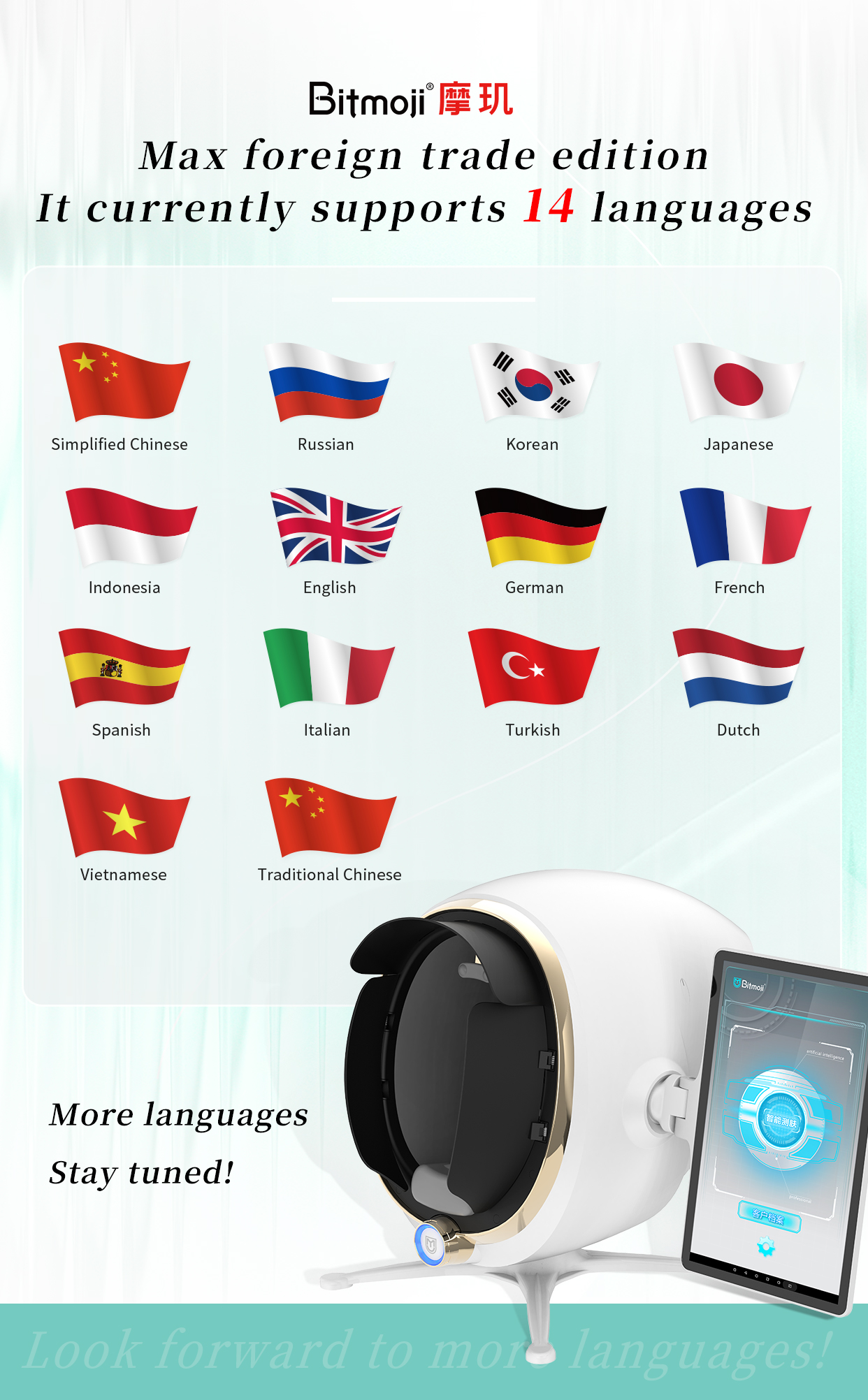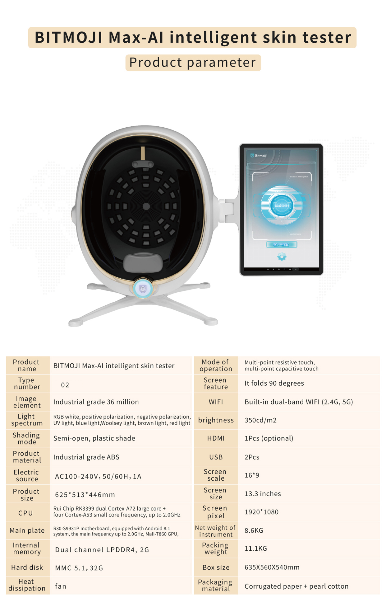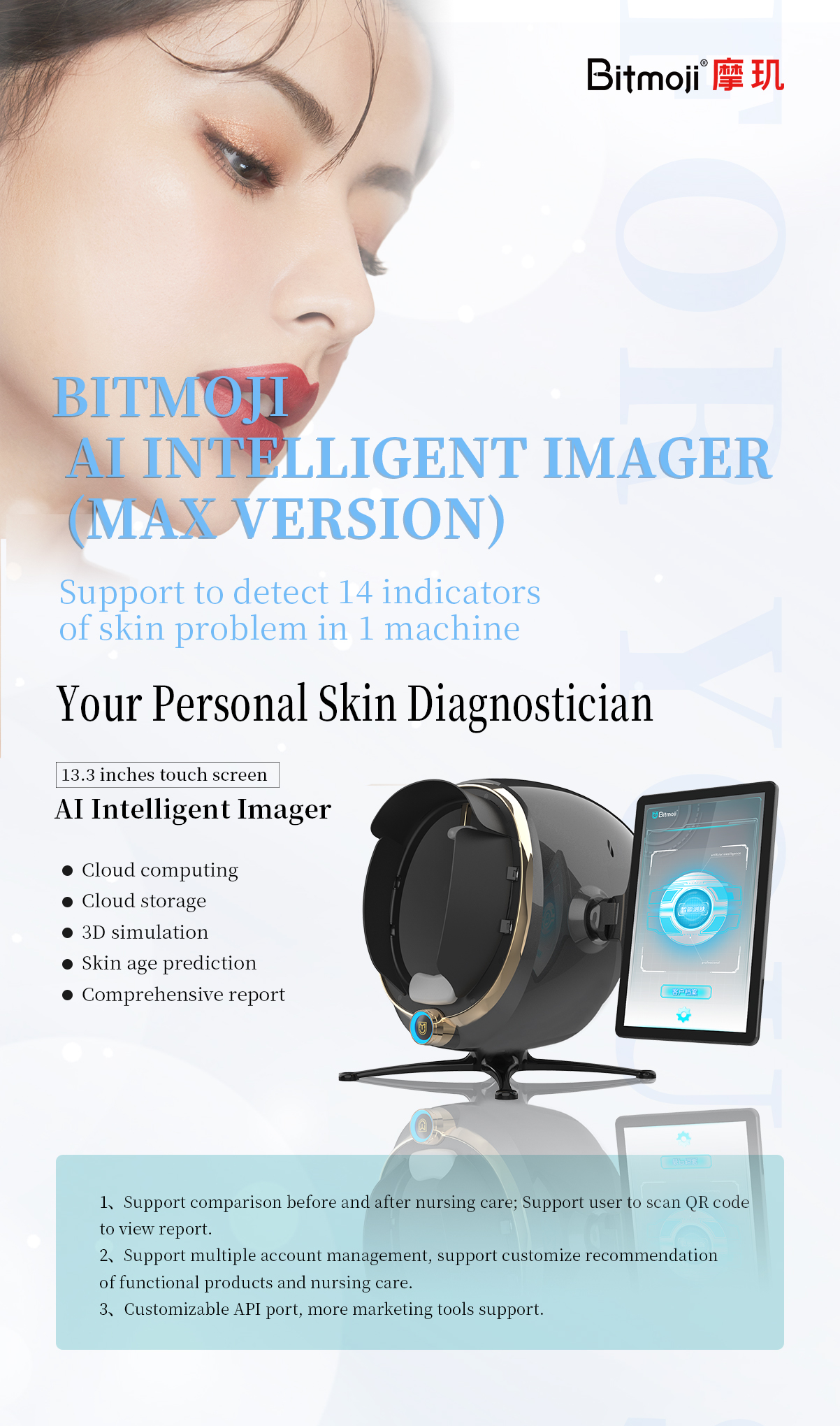 Emoji AI Skin Tester-Max Version captures the images of facial skin through industrial-grade high-definition effects with 8 light sources such as white light, positive polarized light, negative polarized light, UV light, blue light, Wu's light, brown light, and red light. It adopts the technologies of spectral imaging, AI face recognition, deep learning, 3D skin simulation, cloud computing/cloud storage to conduct the quantitative analysis on the pathological features of surficial and deep skin, and comprehensively detect 14 indicators for skin health. Comprehensive analysis and evaluation of skin problems provide reasonable evidences for scientific and accurate management of the skin.