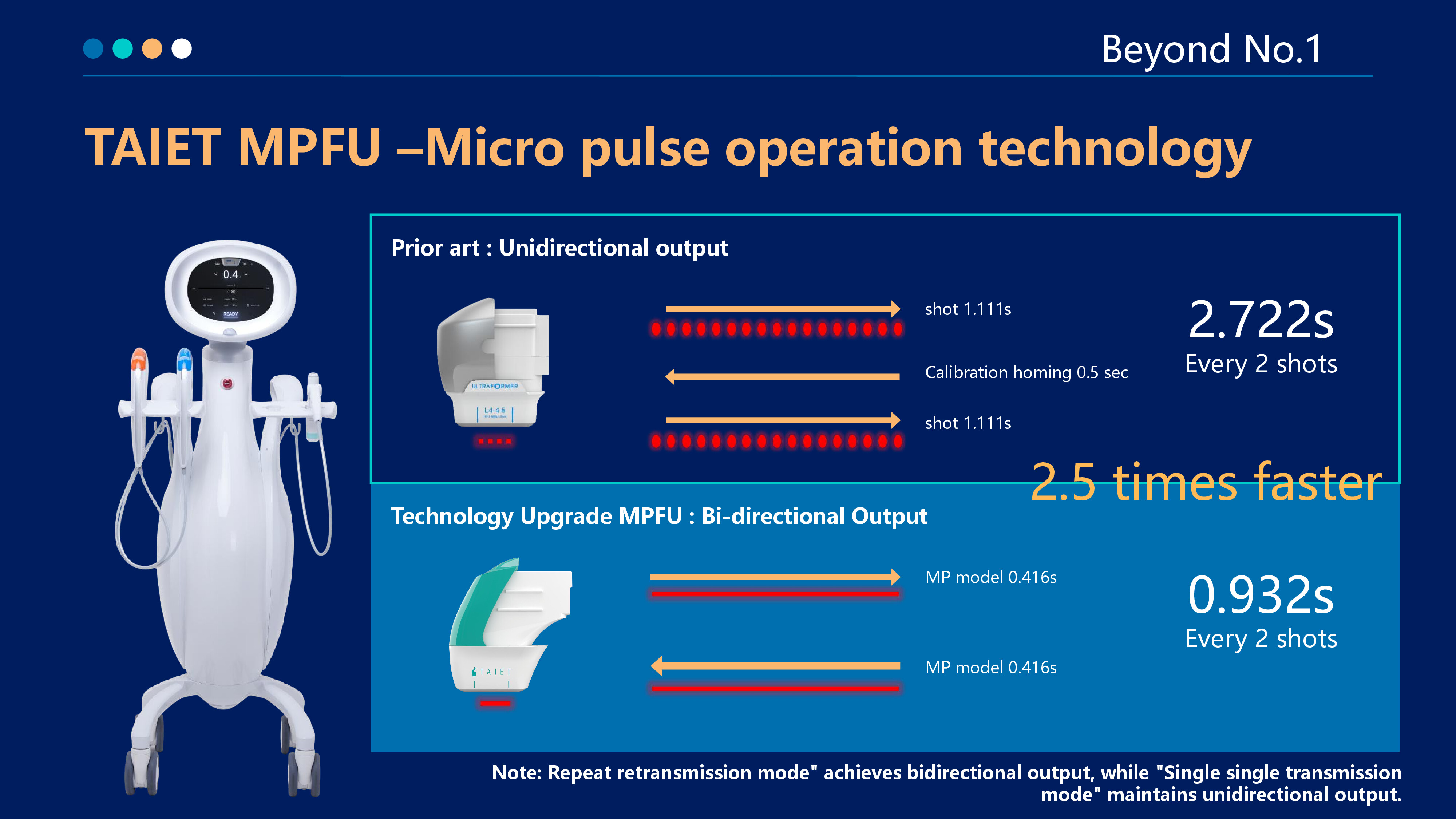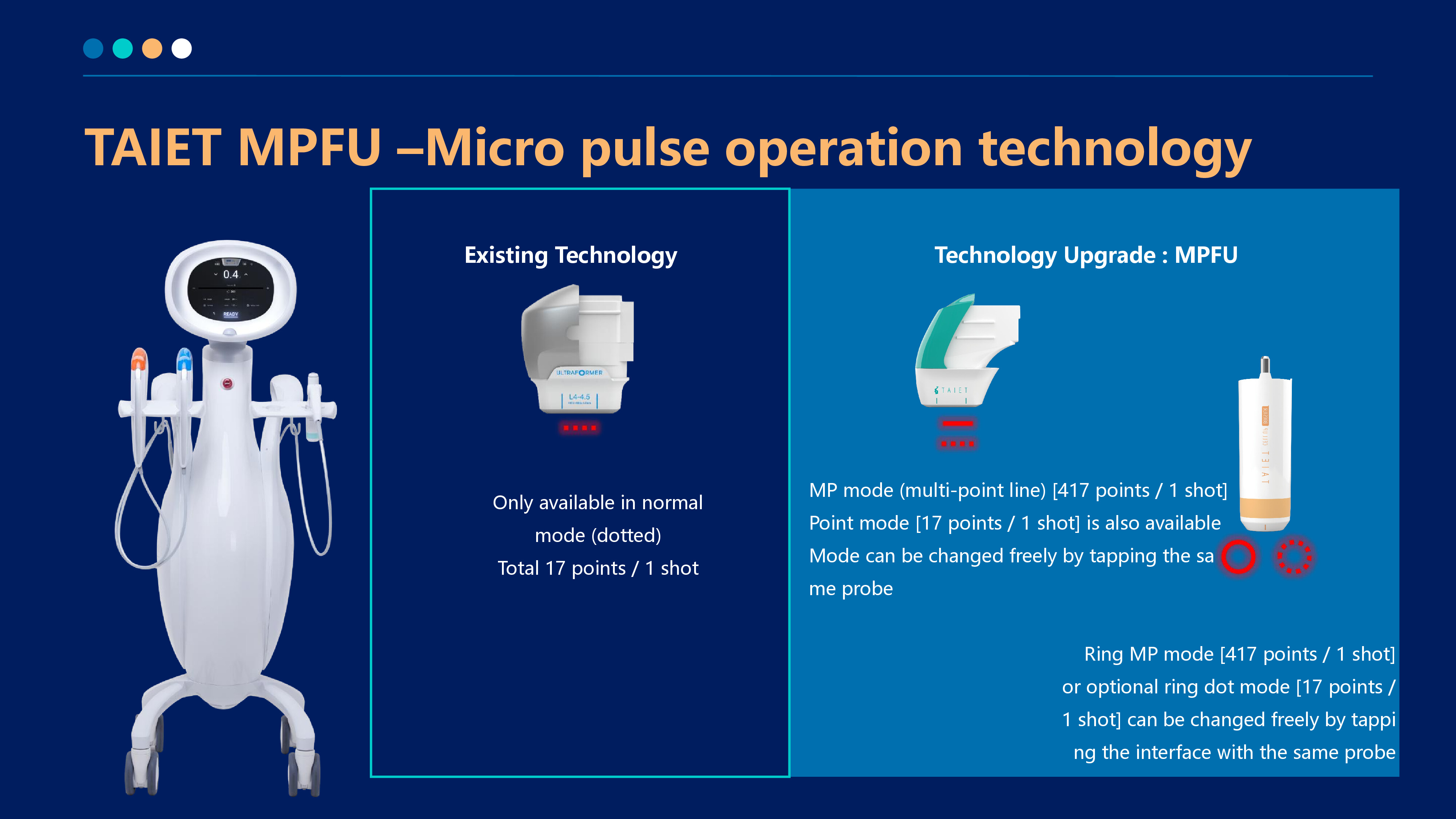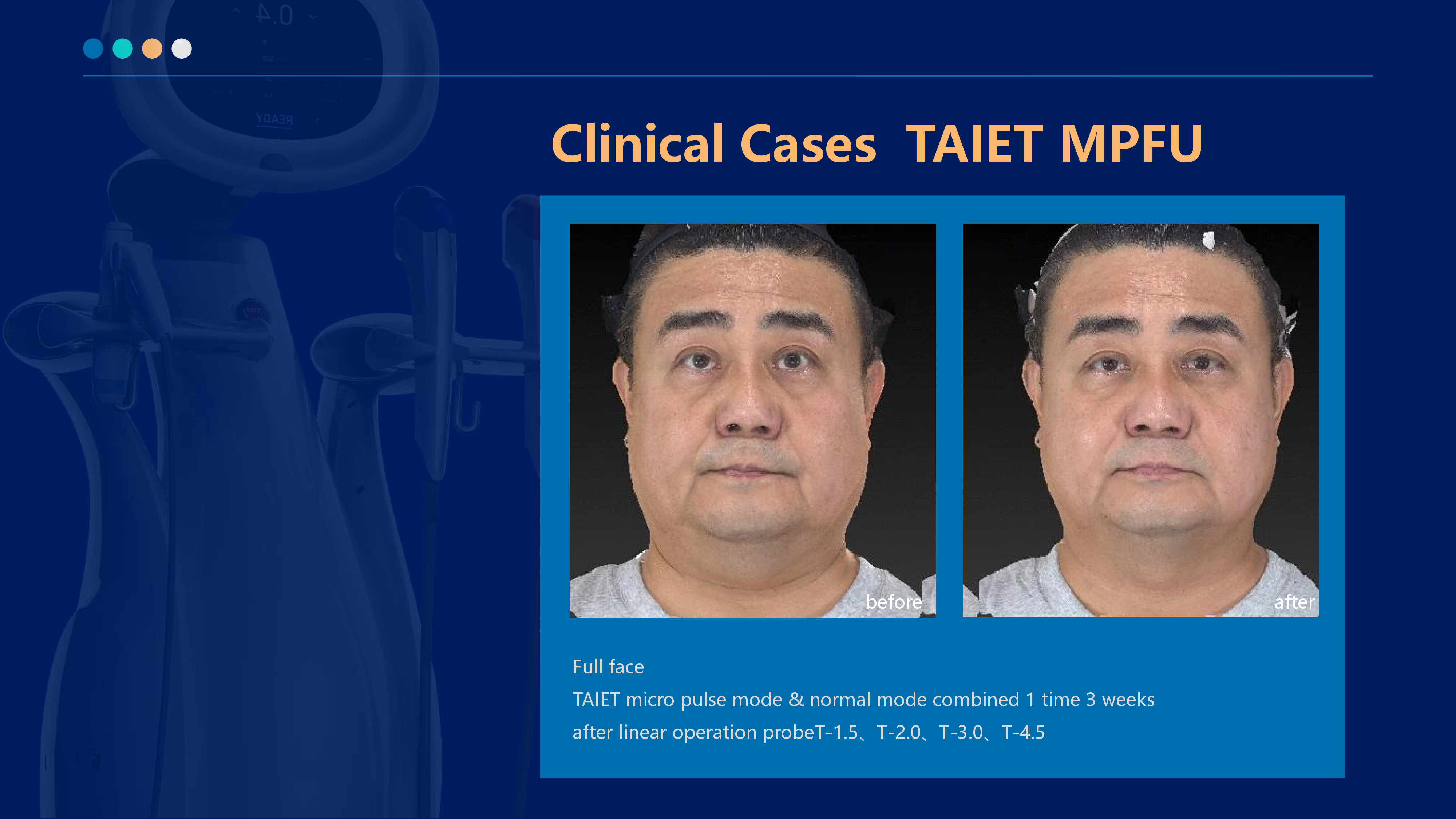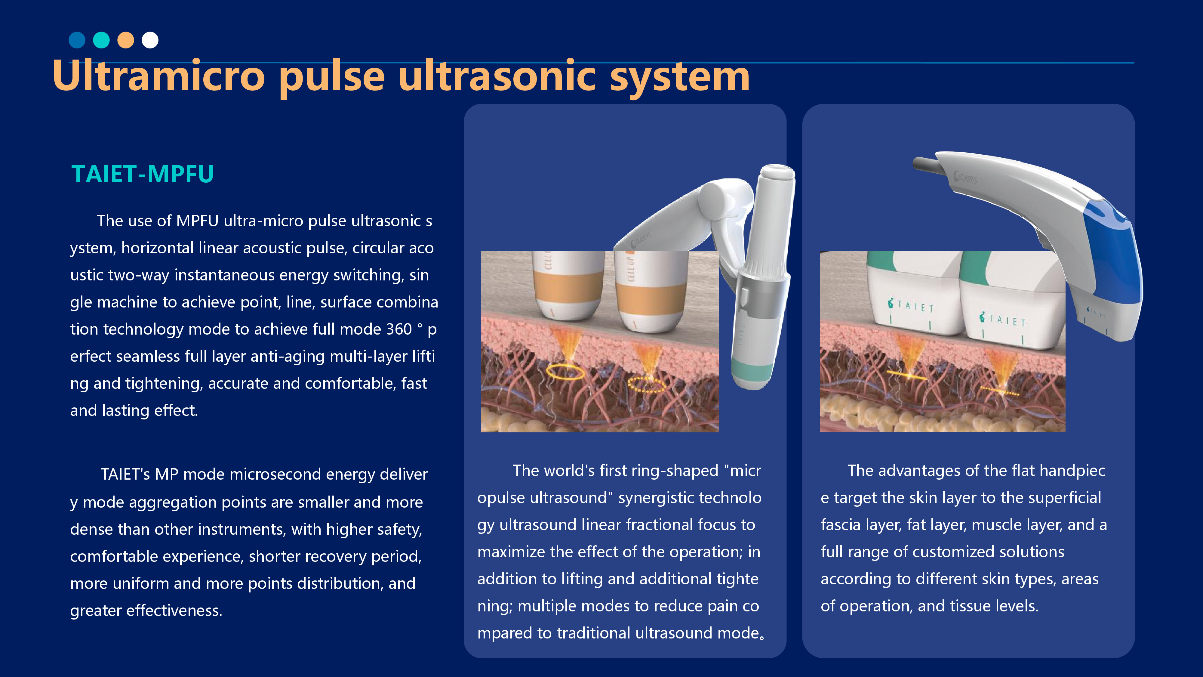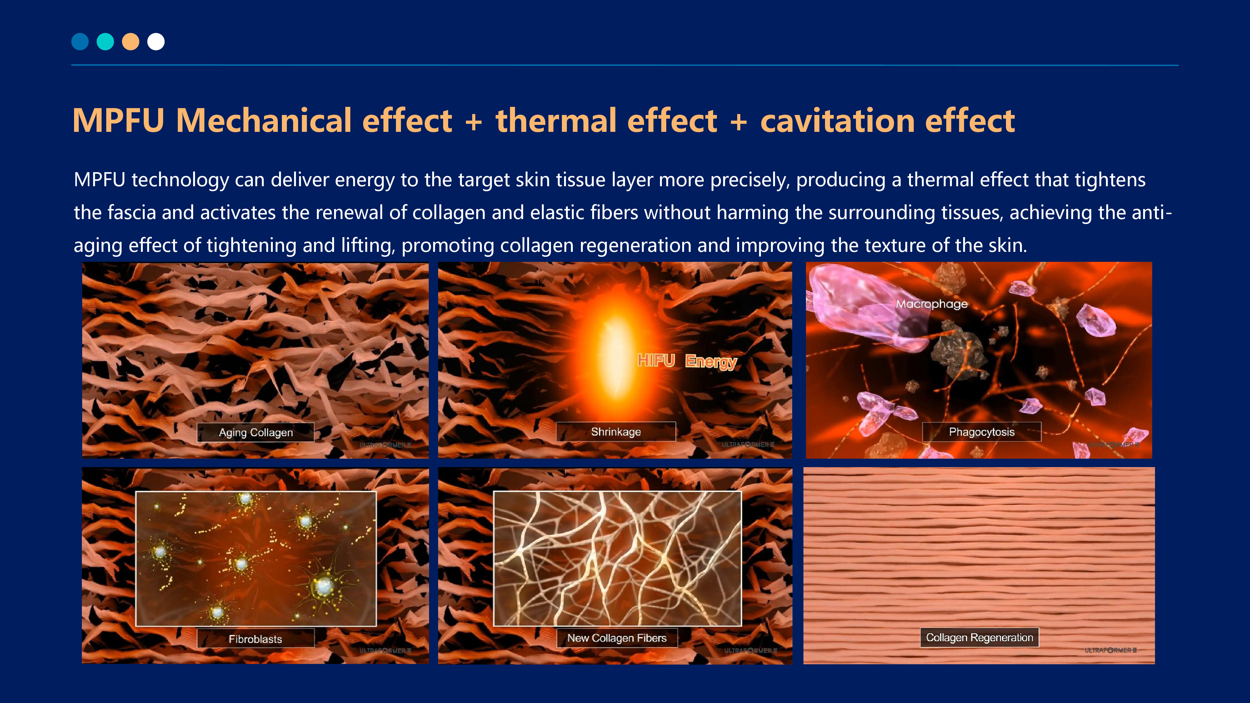 The latest patented ultra-pulse shock wave technology of V-HIFU and P-HIFU is used to generate high-energy focused ultrasound waves that quickly pass through the epidermis. The membranes of the fat layer and SMAS layer shrink, instantly causing the skin tissue to reach a high temperature of 65° C, thereby producing a thermal coagulation effect on the skin, forming a network of coagulation points in the dermis and fascia layer,stimulating the contraction and firming of fibers and collagen, regeneration and repair, and achieving layer-by-layer lifting and firming.