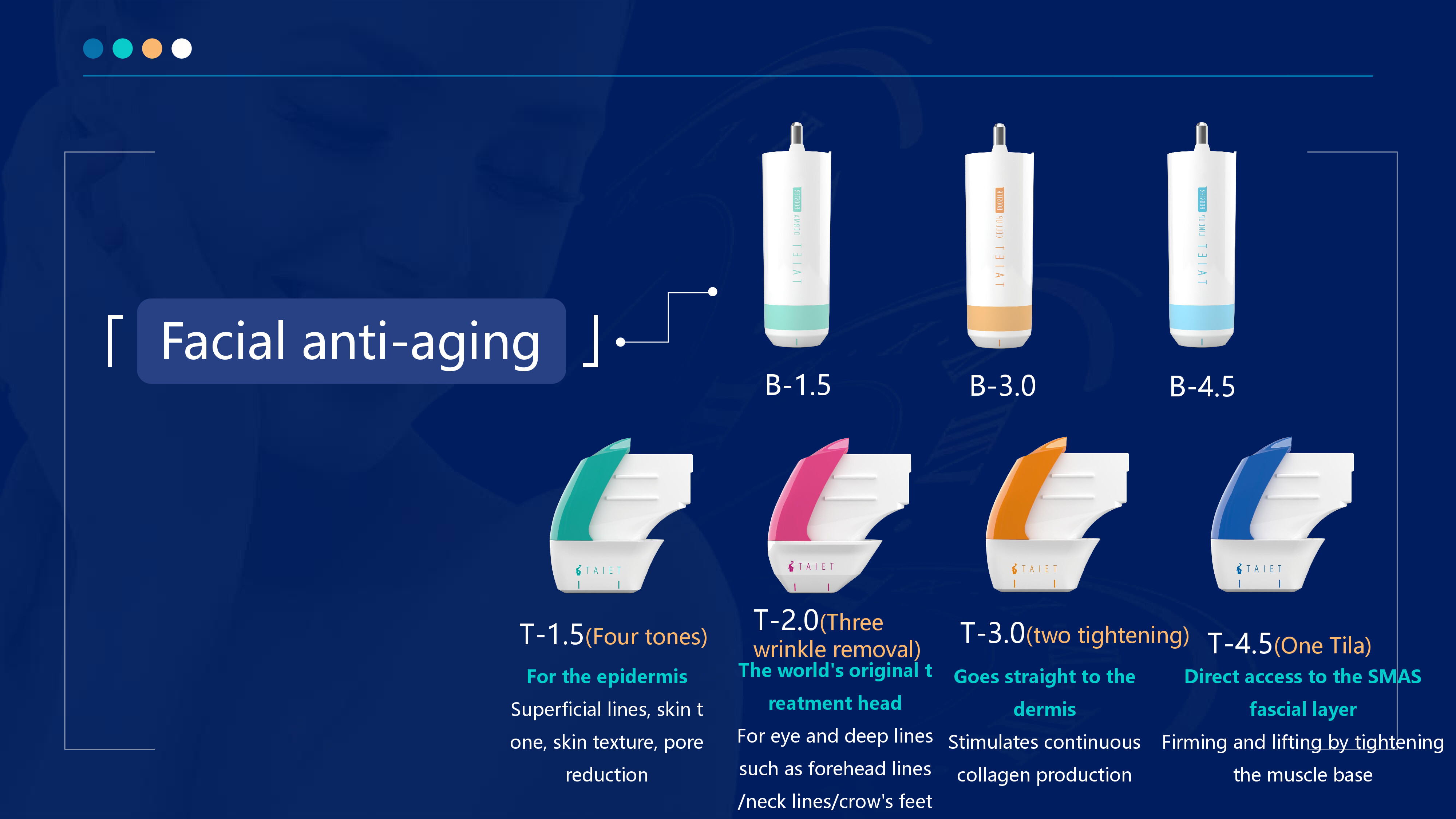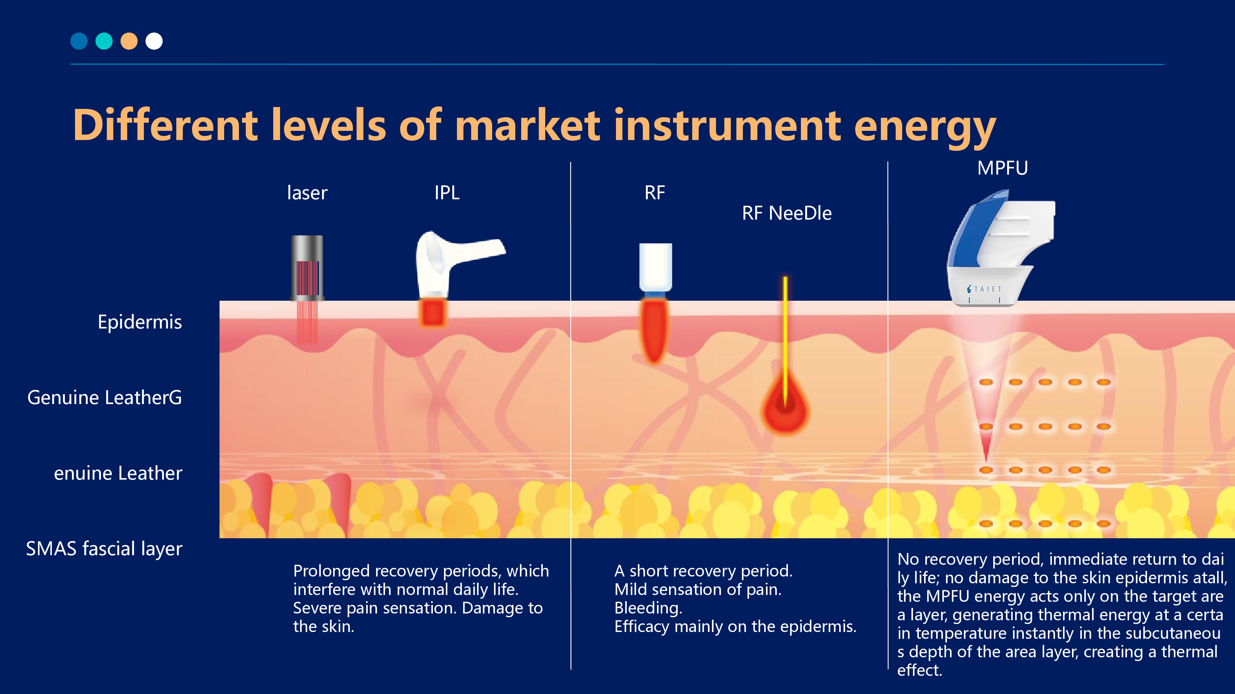 Currently, the internationally advanced anti-aging instrument uses 4 different mechanisms to act on 5 types of tissues in the human body, namely, it uses the current latest medium-frequency current technology, endogenous heat lifting wave technology, and ultra-pulse shock wave technology to apply energy to the epidermis, muscle layer, bone layer, dermis, and fat layer respectively, and layered management to quickly improve the health of the skin and perfectly repair skin blemishes, so as to achieve the effects of dredging, dissolving knots, lifting, firming, brightening, shaping, and beautifying the skin, so that the skin can be in place in one step.